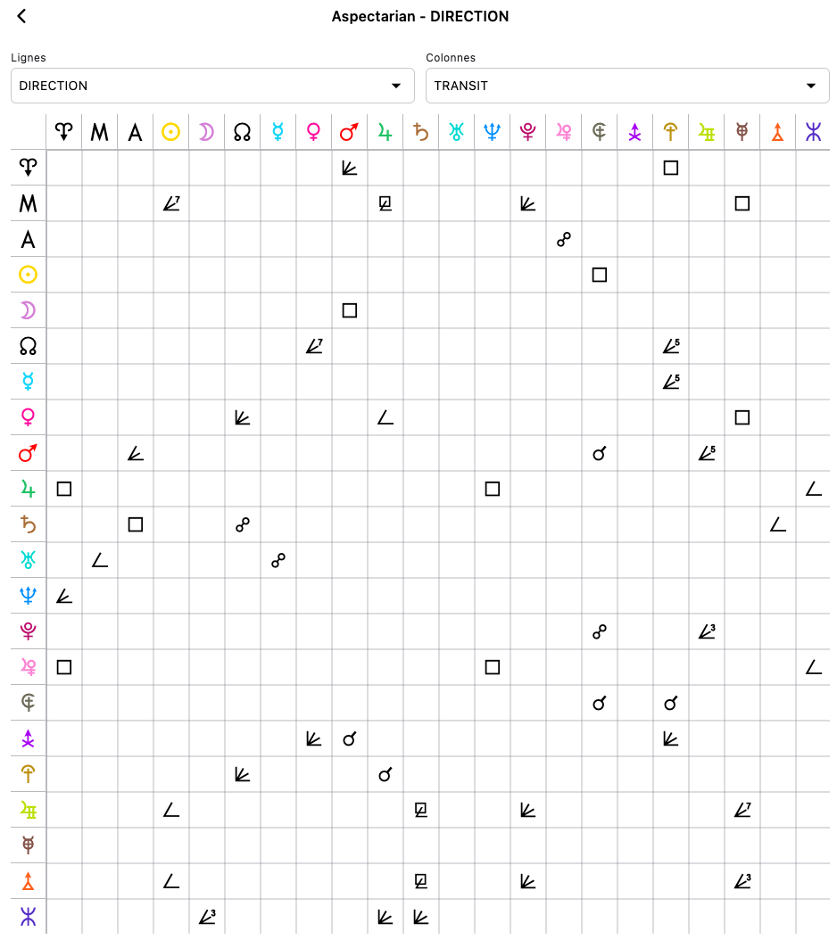 - Aspectarian: addition of a double click on the square 📐 to display an aspectarian allowing you to see at a glance the games of gaze between the planets. Clearer and cleaner than the display of all aspects directly on the wheel. It is always possible to display all aspects with a long click, or double-click to display the aspectarian.