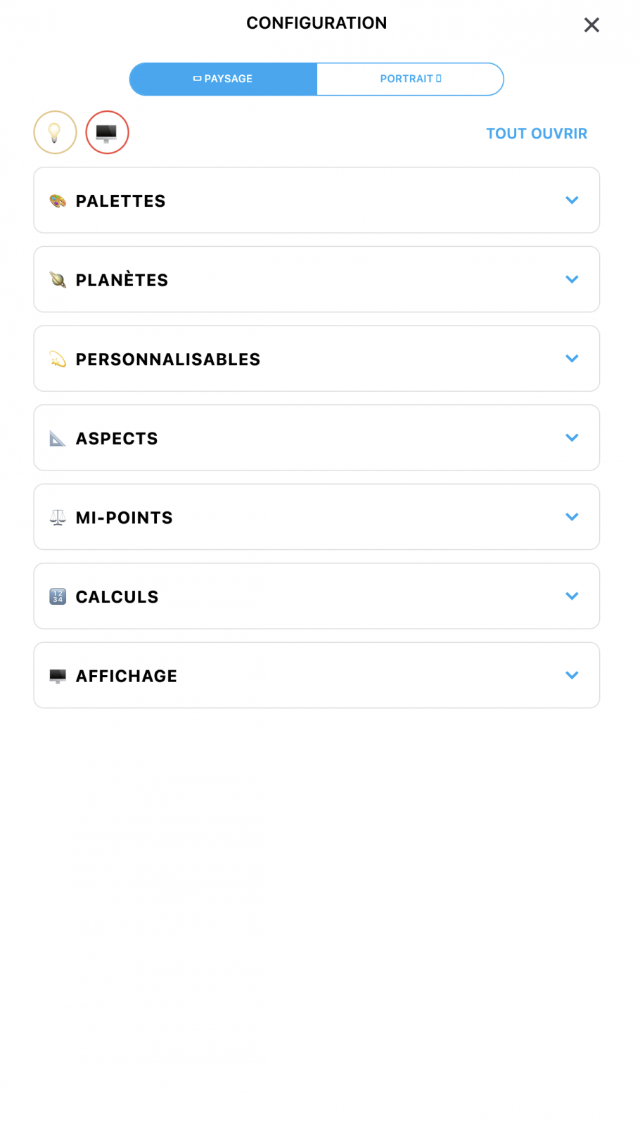 + Still in the configuration panel, all content is now reorganized into blocks that can be opened and closed. And the planets section is now divided into two parts, separating the “normal” celestial bodies on one side, and the “customizable” ones on the other (midpoints, sensitive points, degrees).