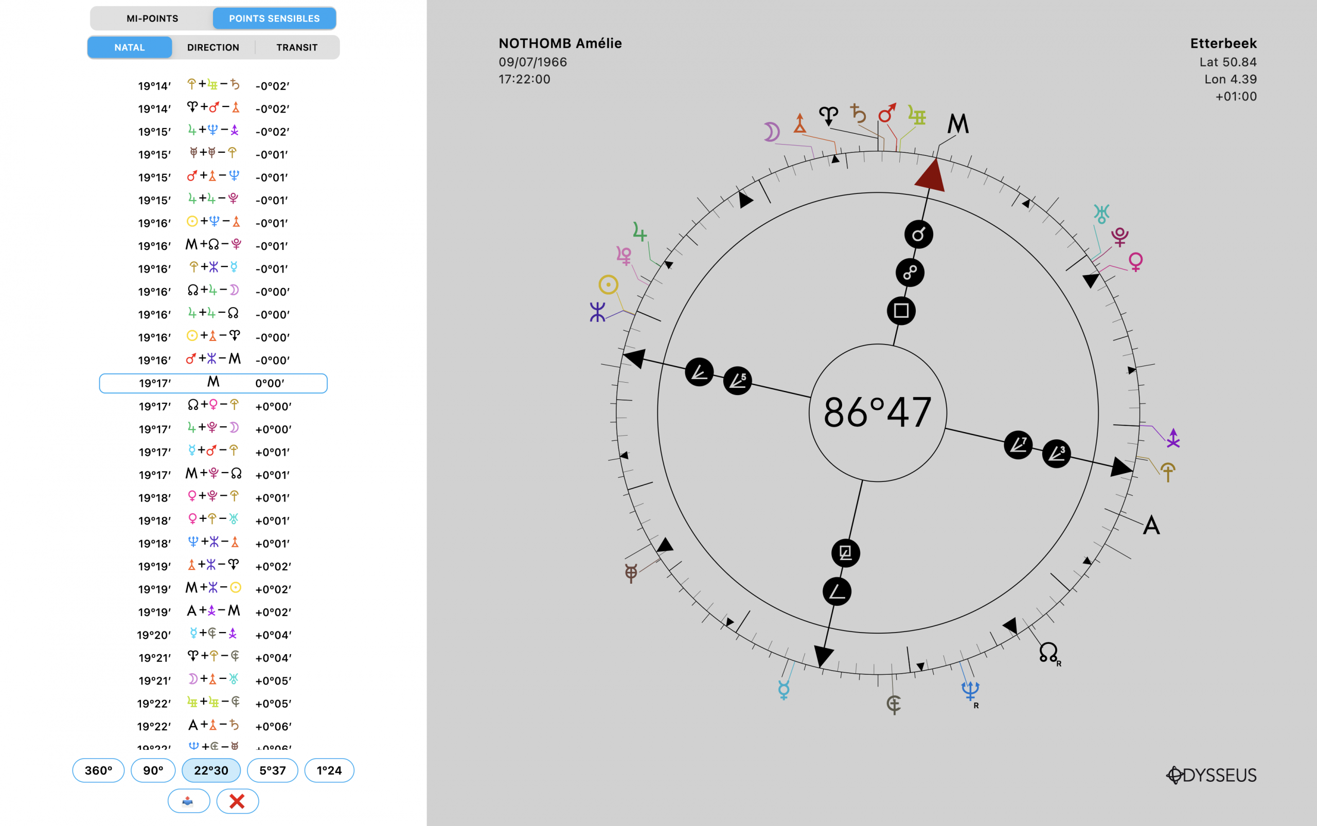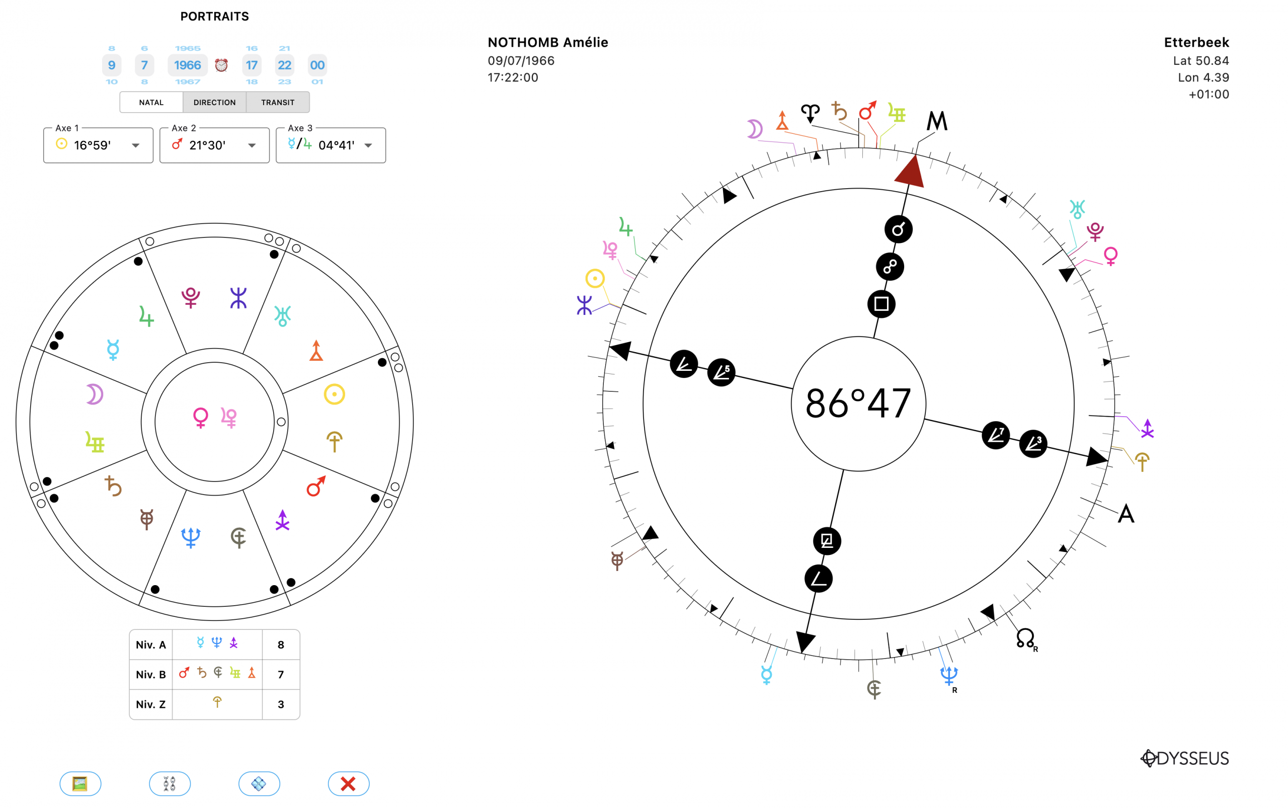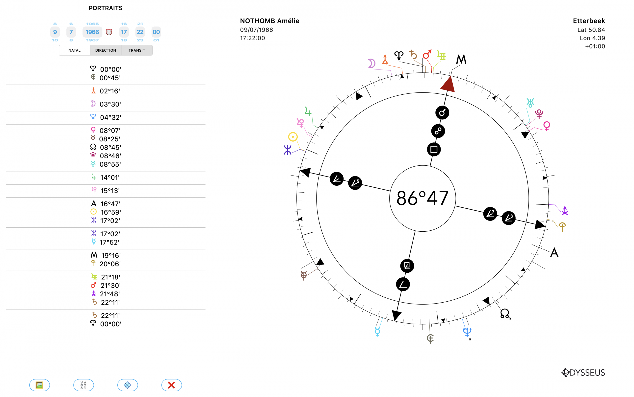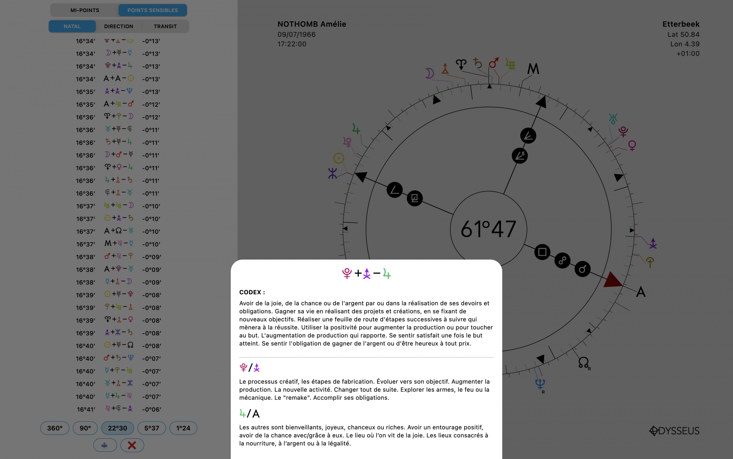 A creation of my own, it had until now only existed in the Olympia Astrologie software, kindly coded by my friend Mathieu Conrad. It can now be found in Odysseus®. The calculation method has been refined to make it more precise (so you will no doubt notice differences compared with what you found on Olympia if you compare them).