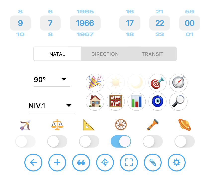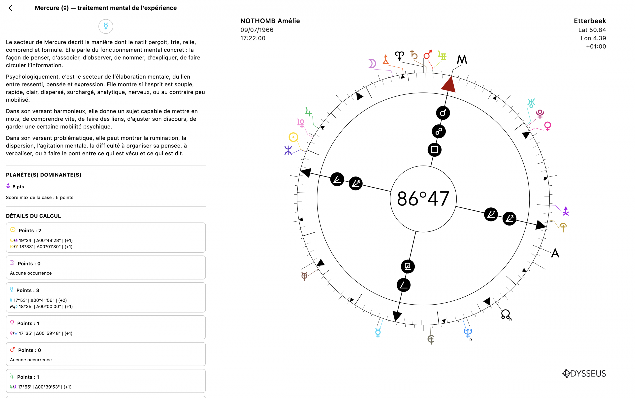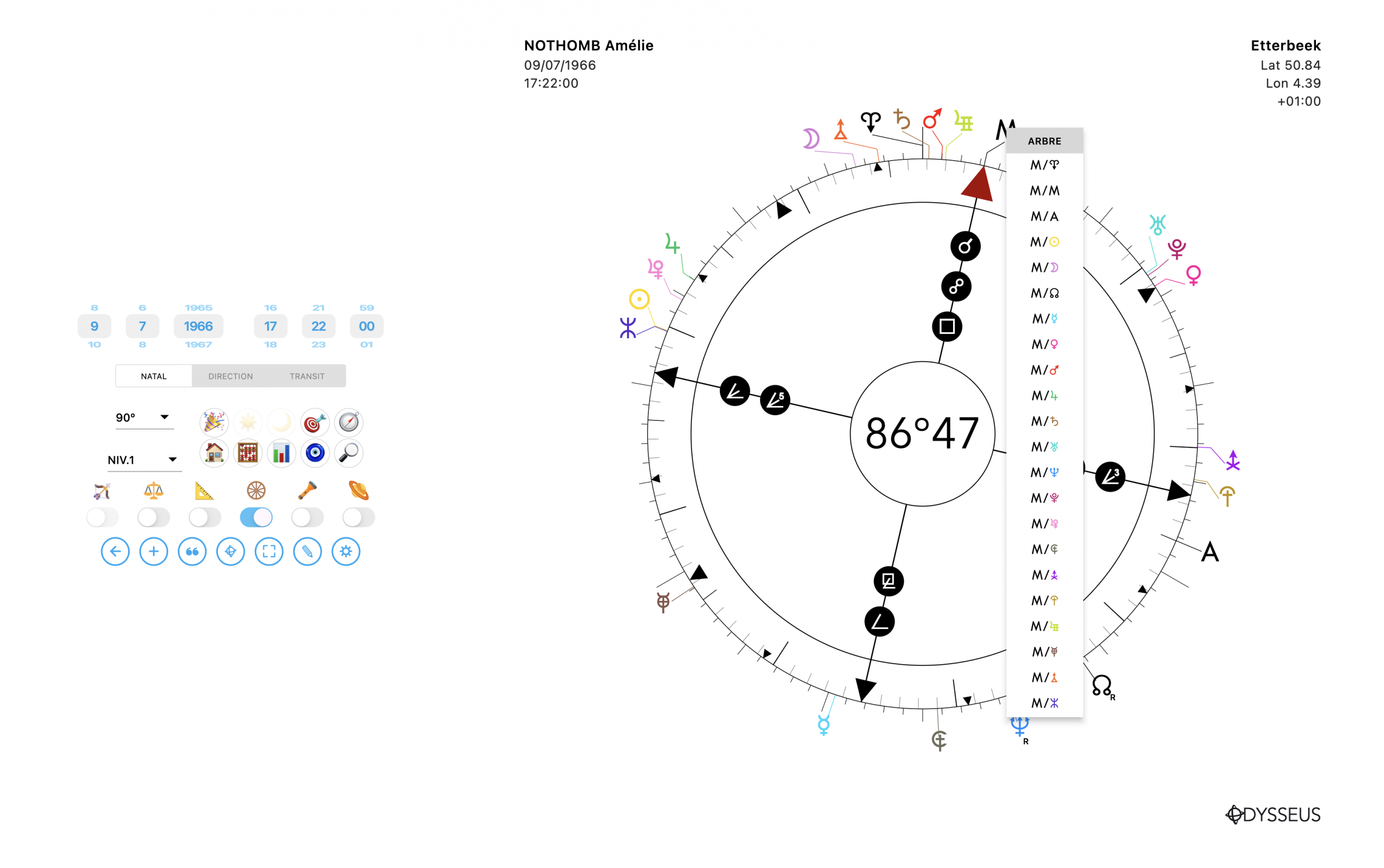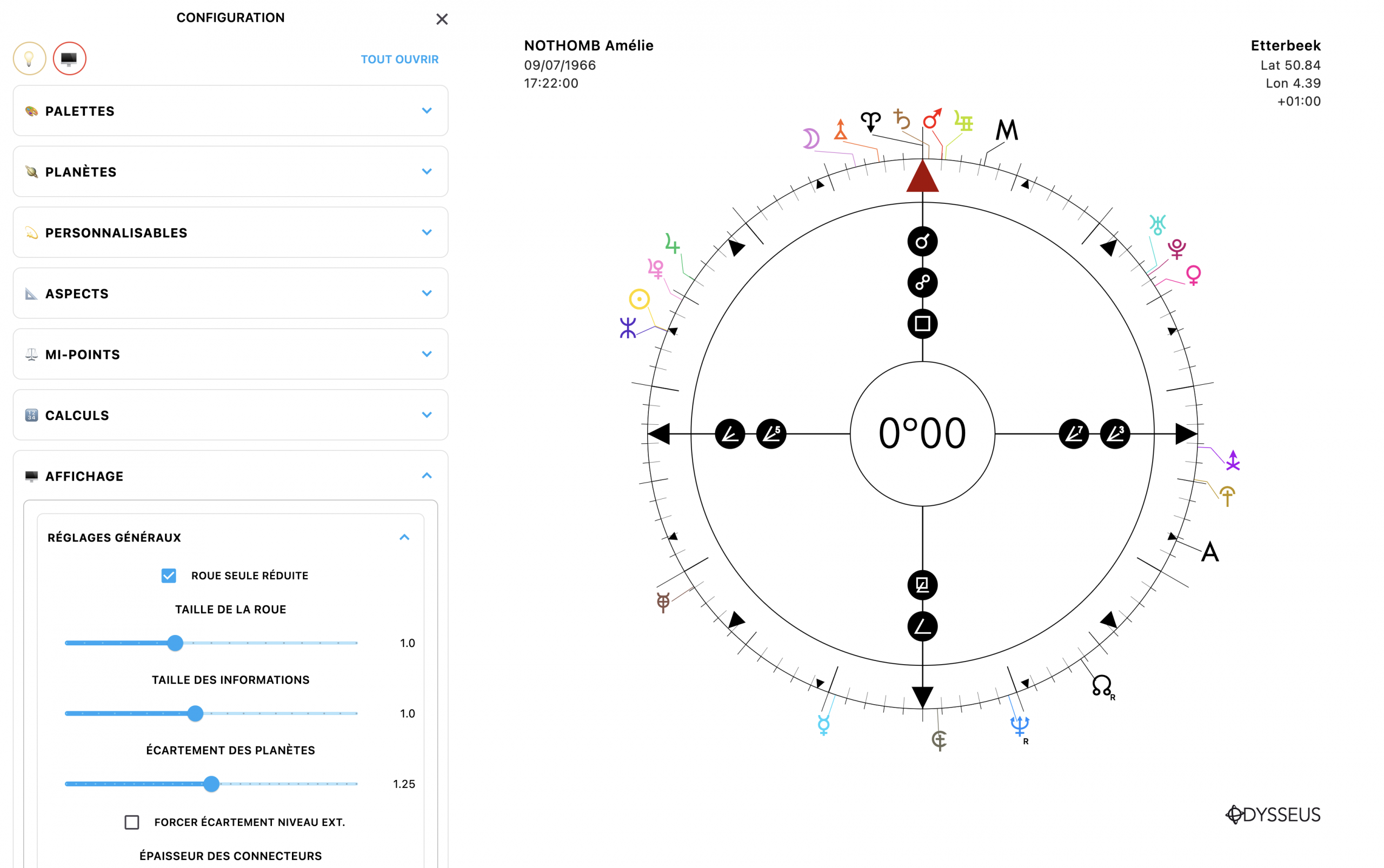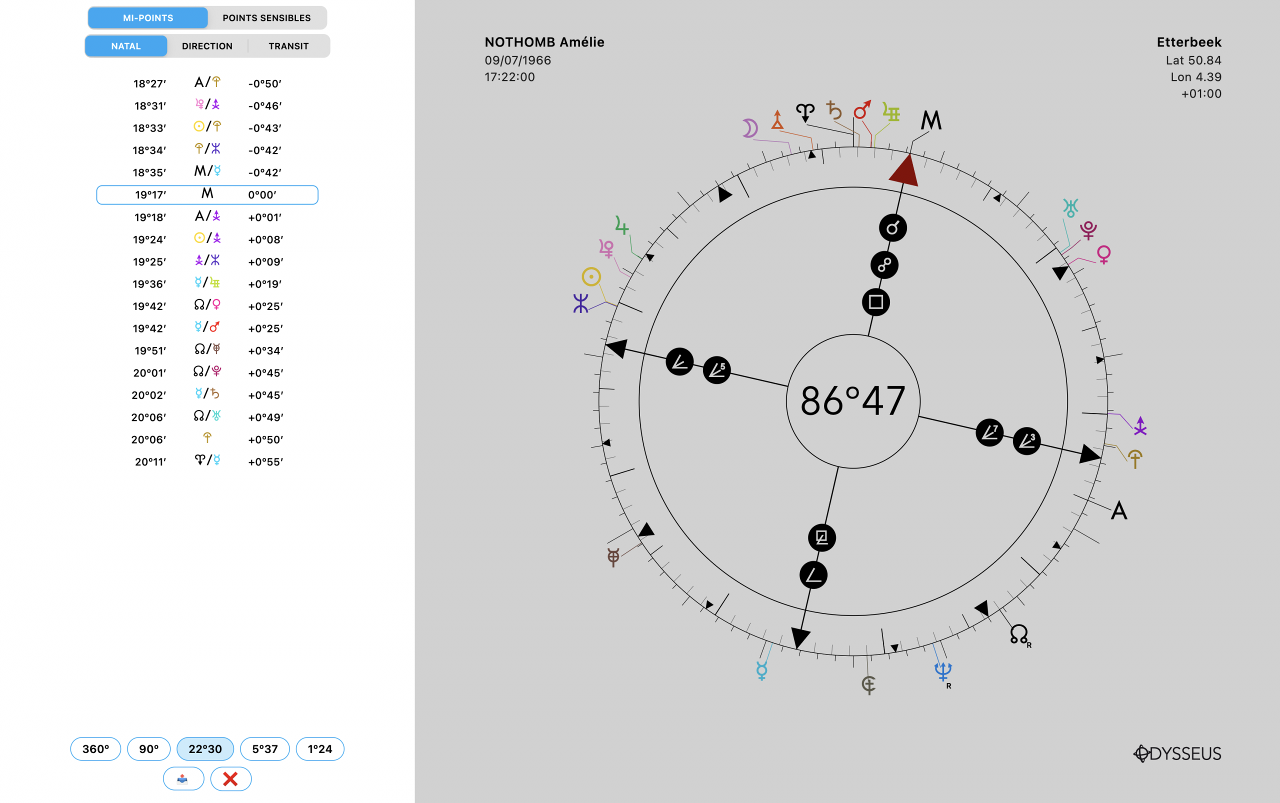 A creation of my own, it had until now only existed in the Olympia Astrologie software, kindly coded by my friend Mathieu Conrad. It can now be found in Odysseus®. The calculation method has been refined to make it more precise (so you will no doubt notice differences compared with what you found on Olympia if you compare them).