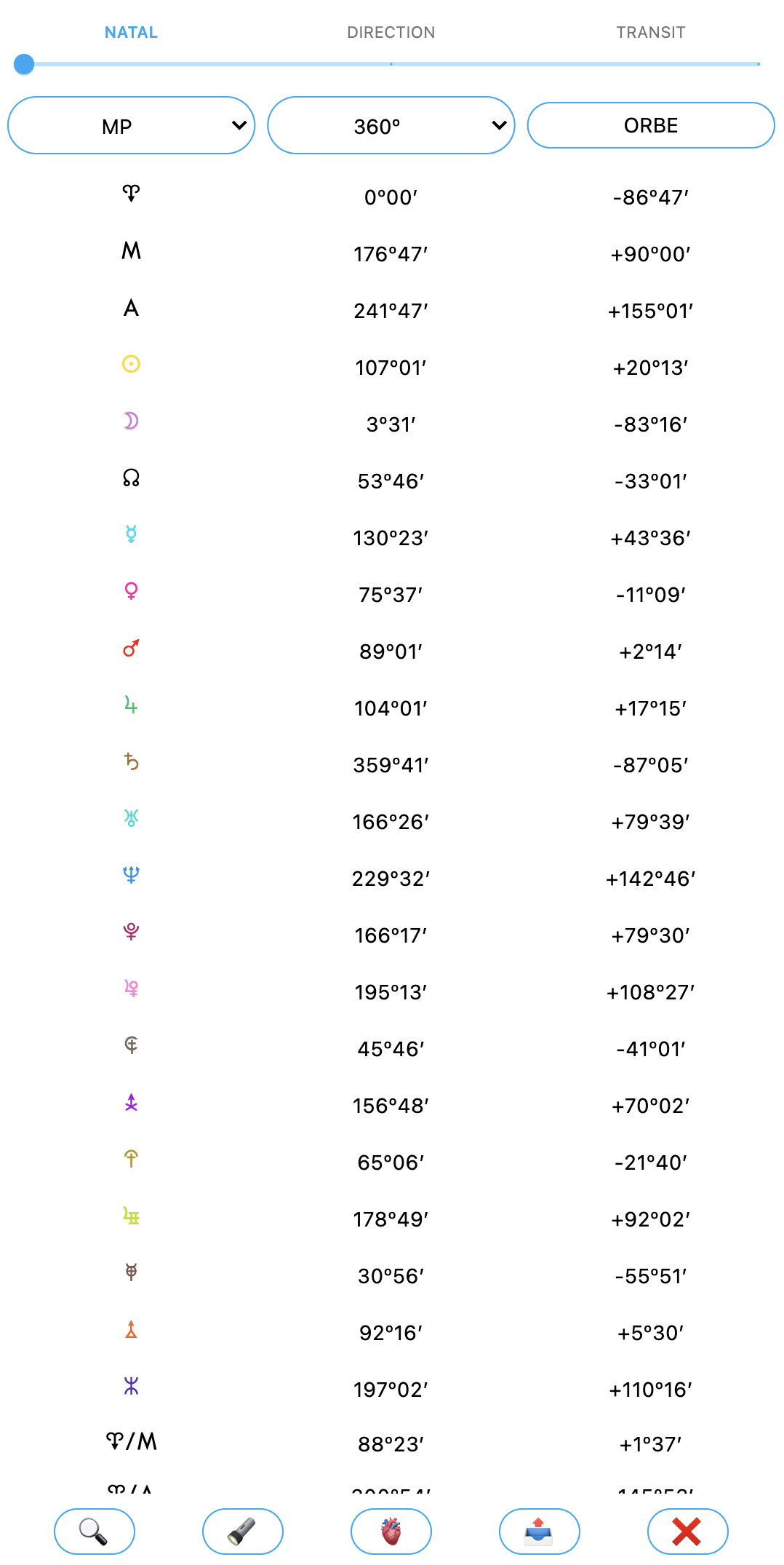 And you also have the possibility of performing the calculation not only with the Midheaven <, but also with the Ascendant >, or with no factor other than the target planet itself. Also, a summary table at the bottom of the page indicates the most present planets, the least present ones, the most energized ones, and the most torpedoed ones.