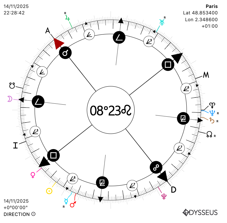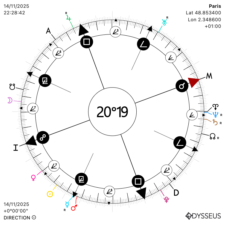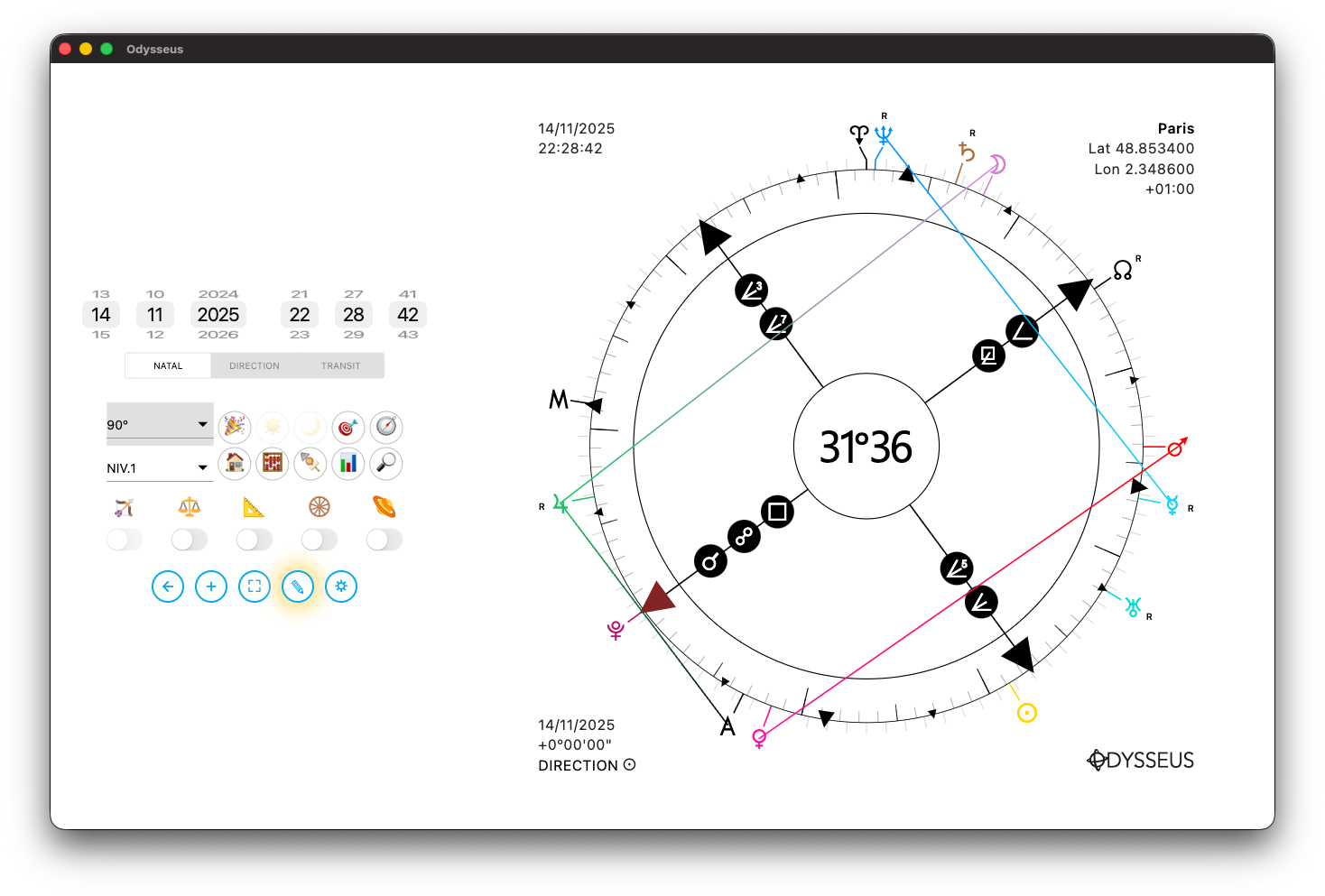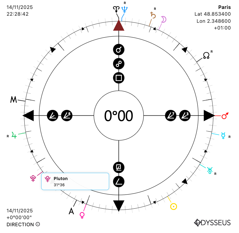 - Les degrés au centre de la roue de 360º peuvent maintenant être affichés soit sur 360º comme d’habitude, soit en 30º+SIGNE. Cette option se change dans le panneau de Configuration, ou encore en faisant un appui long sur le texte au centre de la roue. Dans le panneau de configuration, il est possible de cocher une case permettant l’affichage des degrés sur 30º+SIGNES en calculant le décalage par direction d’arc des signes du zodiaque (puisque le Point Vernal est également dirigé dans le temps). Ainsi, l’affichage sur ce mode lorsque le curseur sera sur DIRECTION sera différent des niveaux NATAL et TRANSIT. Ne l’utilisez que si besoin.