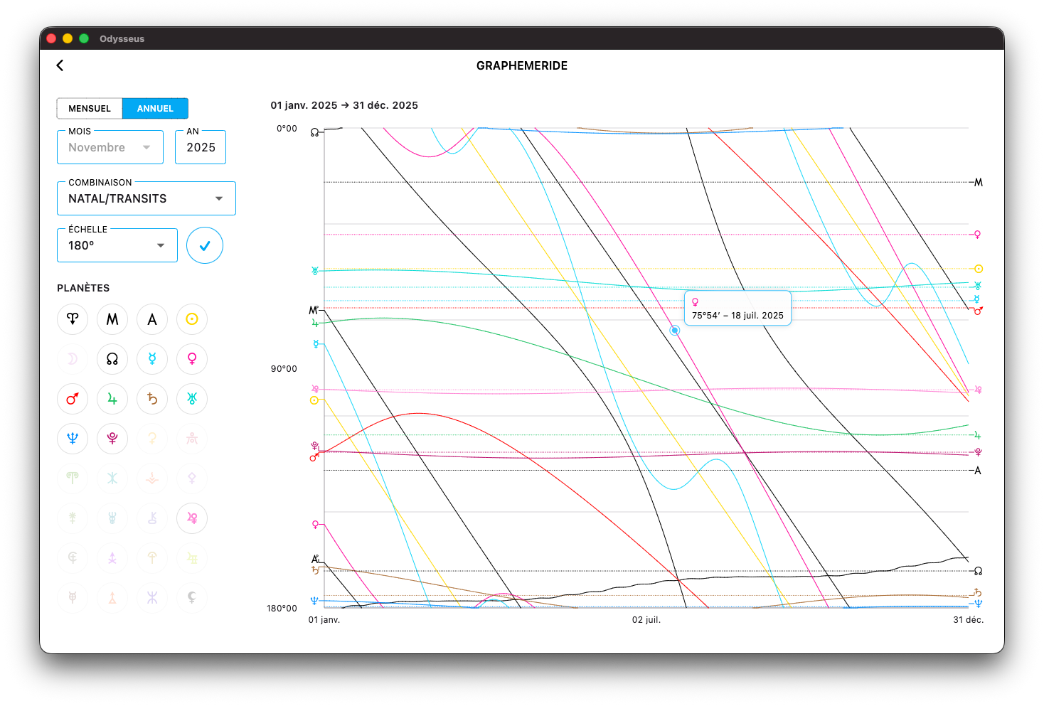- …avec un clic long sur ce bouton, vous vous trouvez face à un générateur d’éphémérides graphiques (ou courbes planétaires) que vous pouvez régler sur de l’affichage mensuel ou annuel, sur différents harmoniques (360º, 180º, 90º, 45º, 22º30, 11º15) et sur différentes combinaisons (natal/direction solaire, natal/direction lunaire, natal/progressions, natal/transit, direction solaire/transit, direction lunaire/transit, progressions/transit). Sur ordinateur, passez votre souris au-dessus des courbes, ou sur téléphone, faites un appui long quelque part sur le graphe puis baladez votre doigt, et une infobulle vous donnera des informations sur ce que vous pointez.