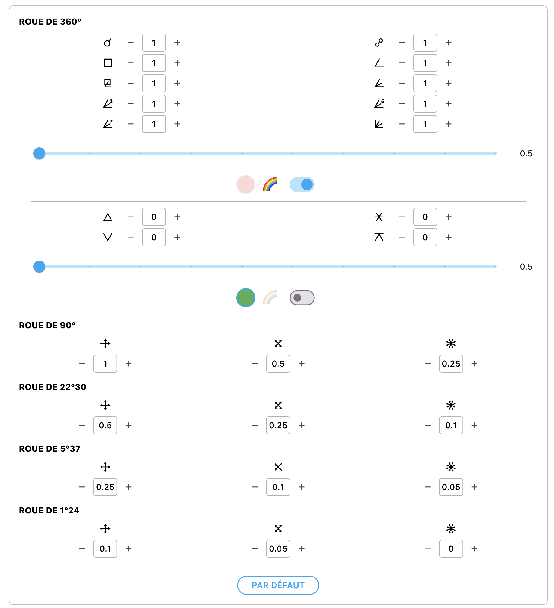 + Autre « petite » nouveauté, il est possible à présent d’afficher les « personnalisables » (mp, ps, degrés) en clair directement sur la roue. Vous pouvez toujours choisir d’afficher un emoji à la place si vous le souhaitez, évidemment. À cela se couple donc évidemment une légère refonte sur panneau de configuration ⛭ pour afficher des boutons plus grands, donc plus lisibles, et en plus grand nombre.
