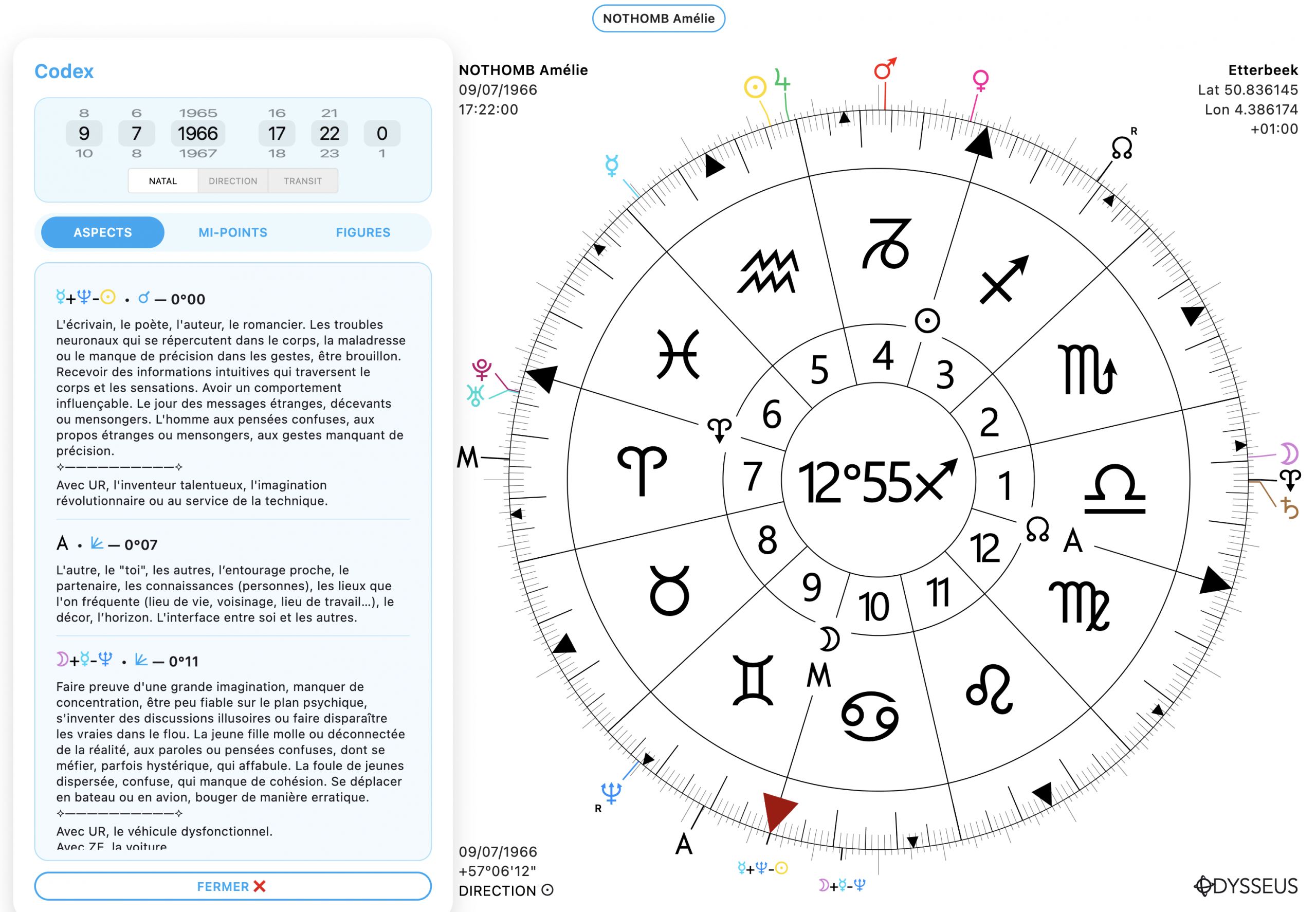 Vous y trouverez trois onglets : Aspects, Mi-points et Figures, ainsi que les molettes de date et heure, le slider des 3 niveaux, les planètes impliquées, l’angle formé, l’orbe et la description. Et ÉVIDEMMENT !, vos propres descriptions entrées dans le Grimoire ! QUE DEMANDER DE PLUS ‽