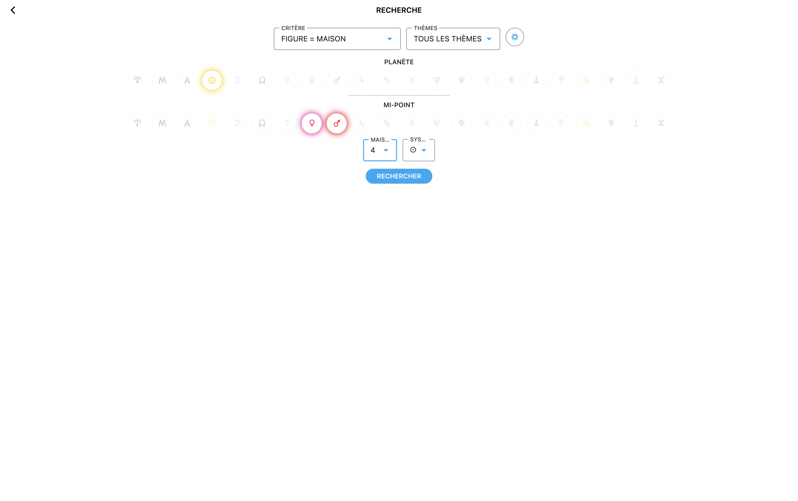 + Et enfin, pas une grande révolution, mais à présent dans le gestionnaire de thème 🗂️, vous trouverez un moteur de recherche 🔍 basé sur des critères astrologiques afin de trouver quels sont vos thèmes enregistrés qui présentent par exemple telle planète sur tel mi-point, ou tel point sensible dans telle Maison. En cliquant dessus, ça vous ouvre le thème automatiquement, et en revenant en arrière, vous êtes ramené au formulaire de recherche. TRÈS pratique, je l’avoue ! C’est presque par pur plaisir personnel que je l’ai fait. Enjoy !