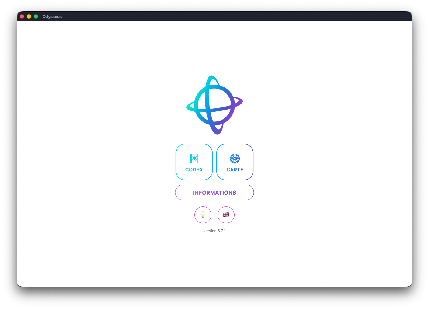 En tout premier, on trouve à gauche le bouton CODEX ˚, à droite le bouton CARTE ˘, en dessous le bouton INFORMATIONS, puis sur le bas de l’écran, le bouton de mode 💡, le bouton de langue 🇫🇷🇬🇧, et encore en dessous le numéro de la version.
