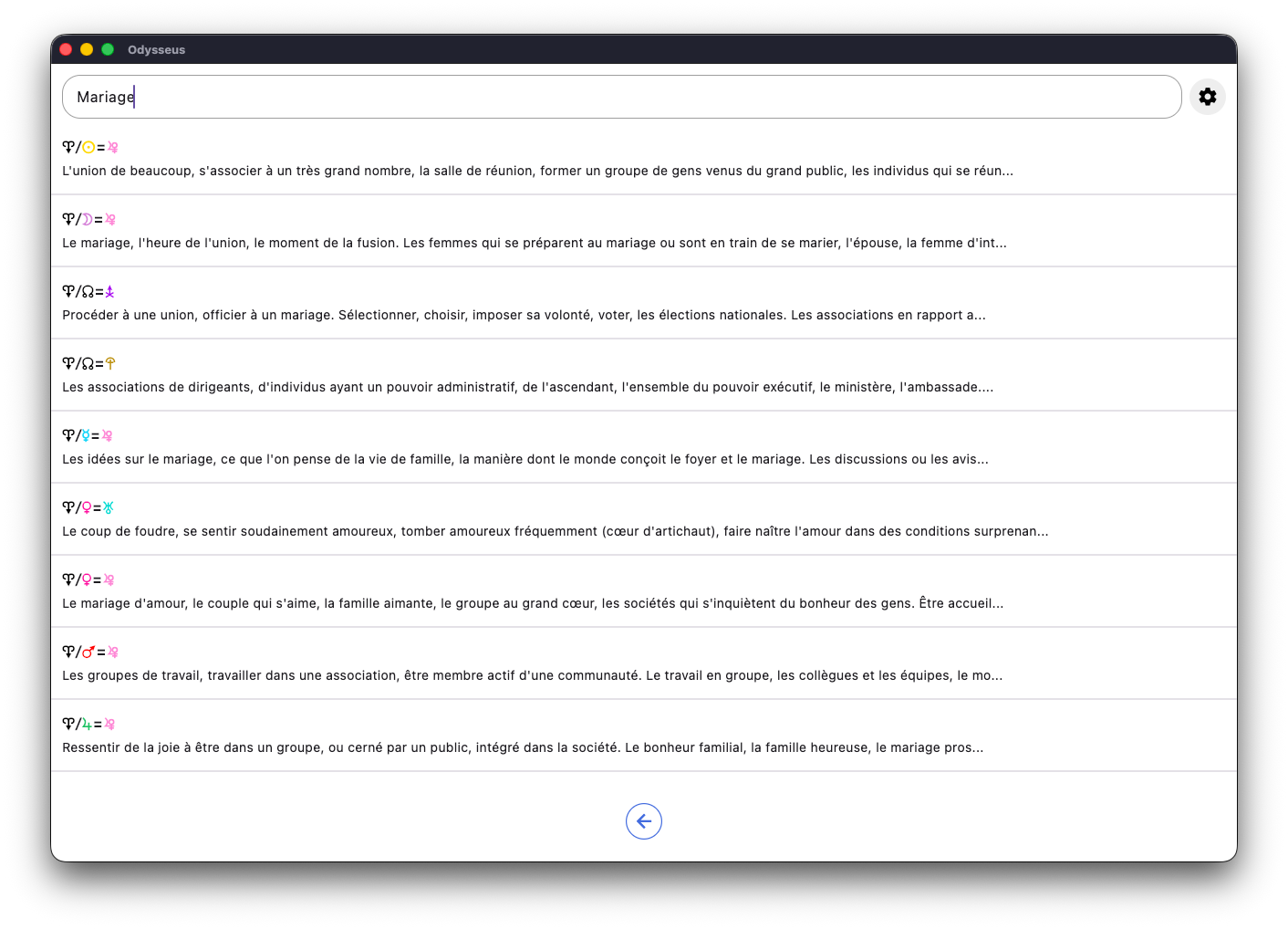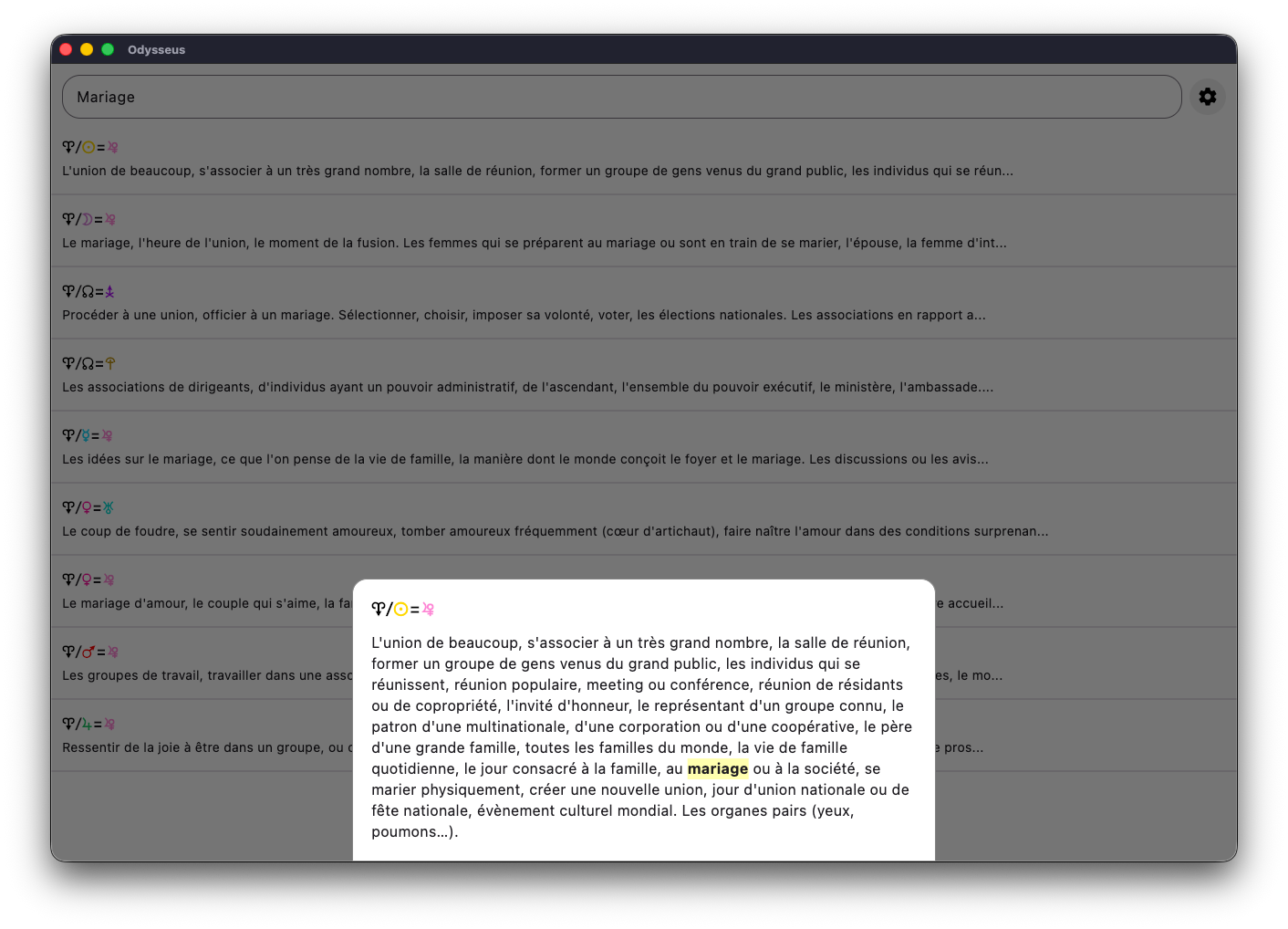 Il vous suffit ensuite de taper au moins 3 lettres dans la barre de recherche pour trouver des définitions les contenant. Ici avec le mot Mariage :