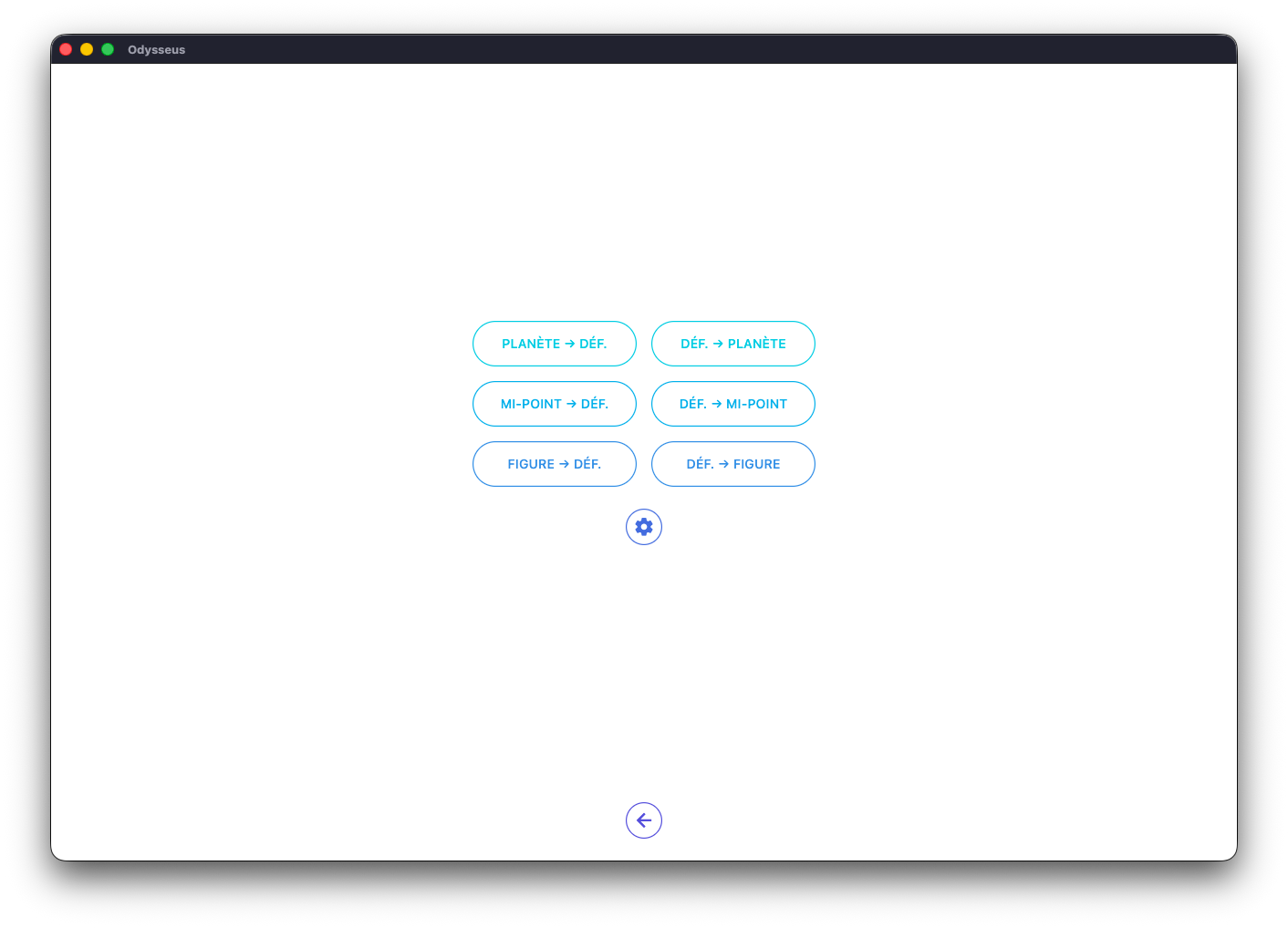 Vous pouvez sélectionner les planètes que vous voulez voir intervenir dans les quiz. Puis, il suffit de choisir le type de quiz qui vous intéresse. Par exemple, Planète vers Définition :