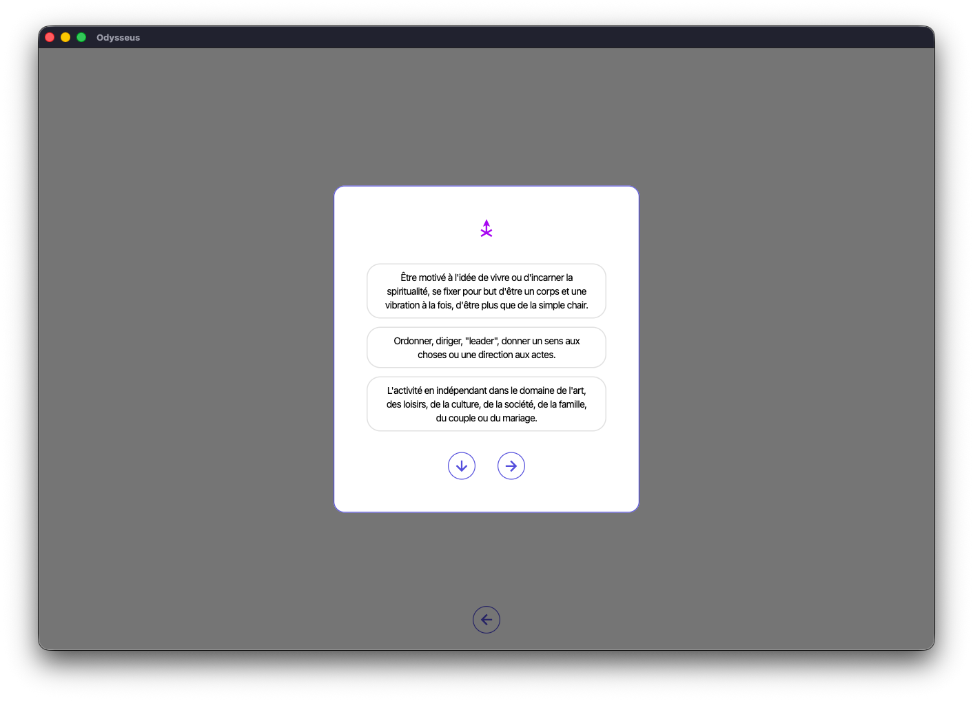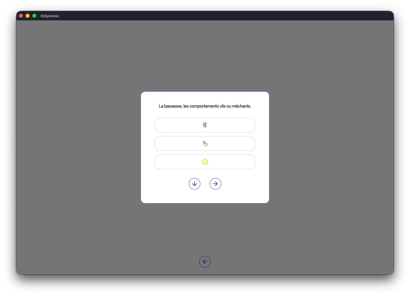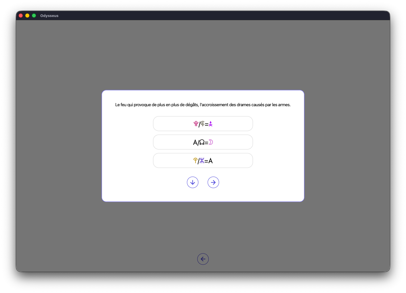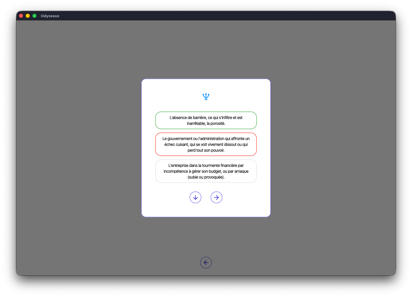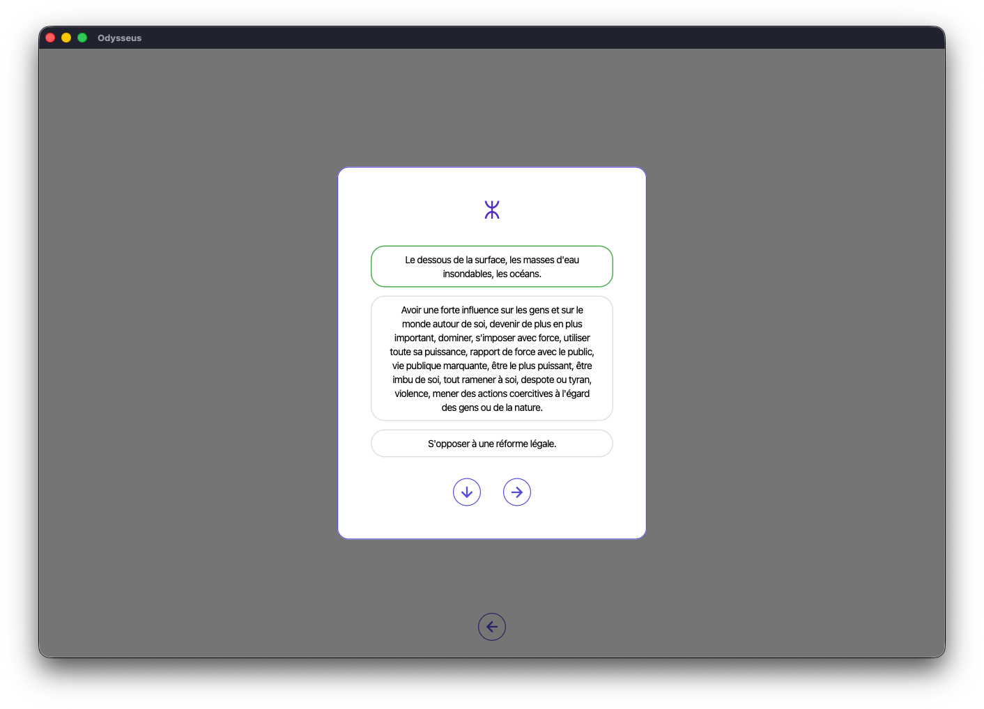 Vous trouverez alors le symbole en haut, et 3 possibilités de définitions. Ainsi que 2 boutons de flèches : une vers le bas pour refermer la fenêtre, une vers la droite pour aller au quiz suivant.