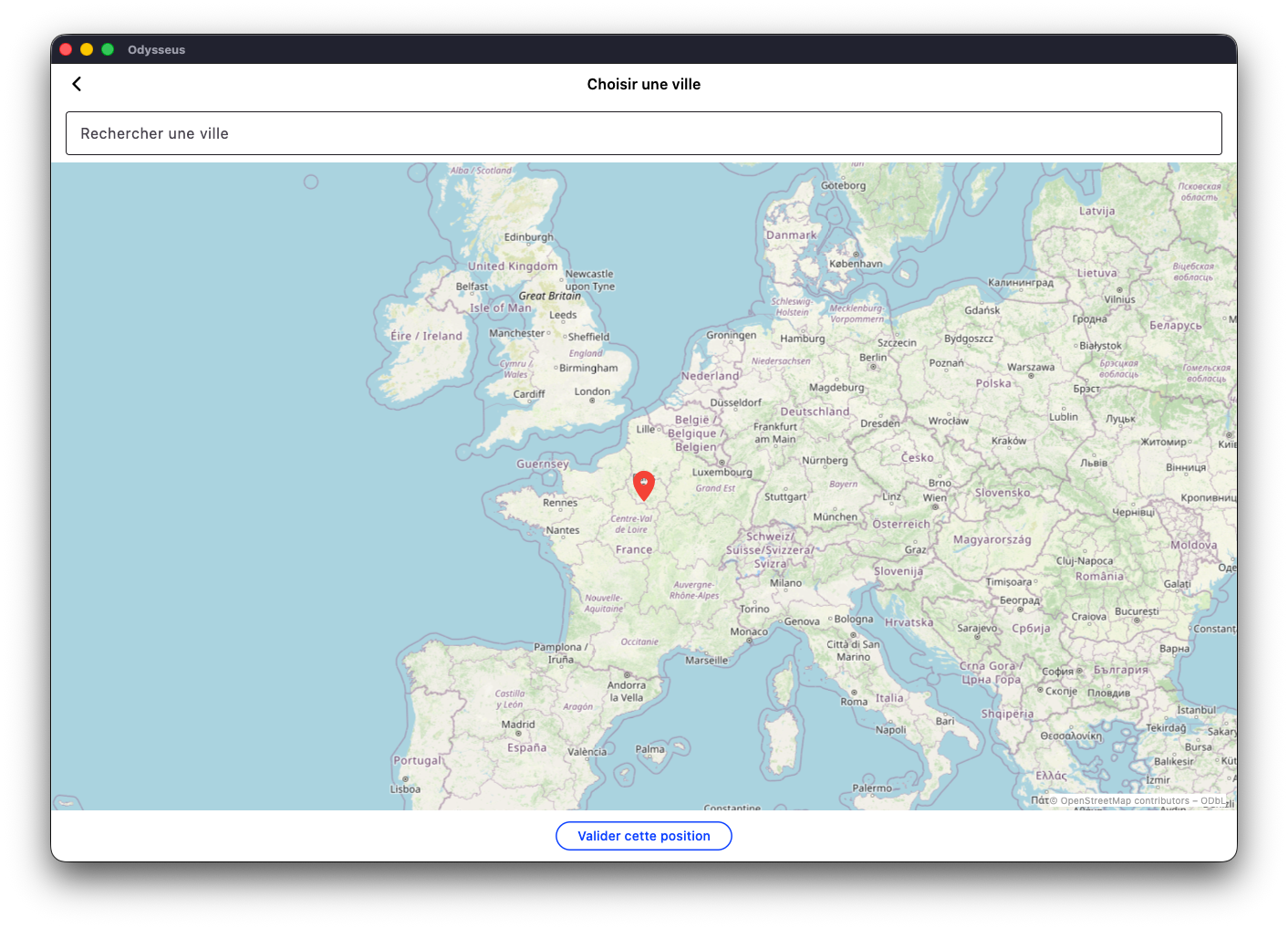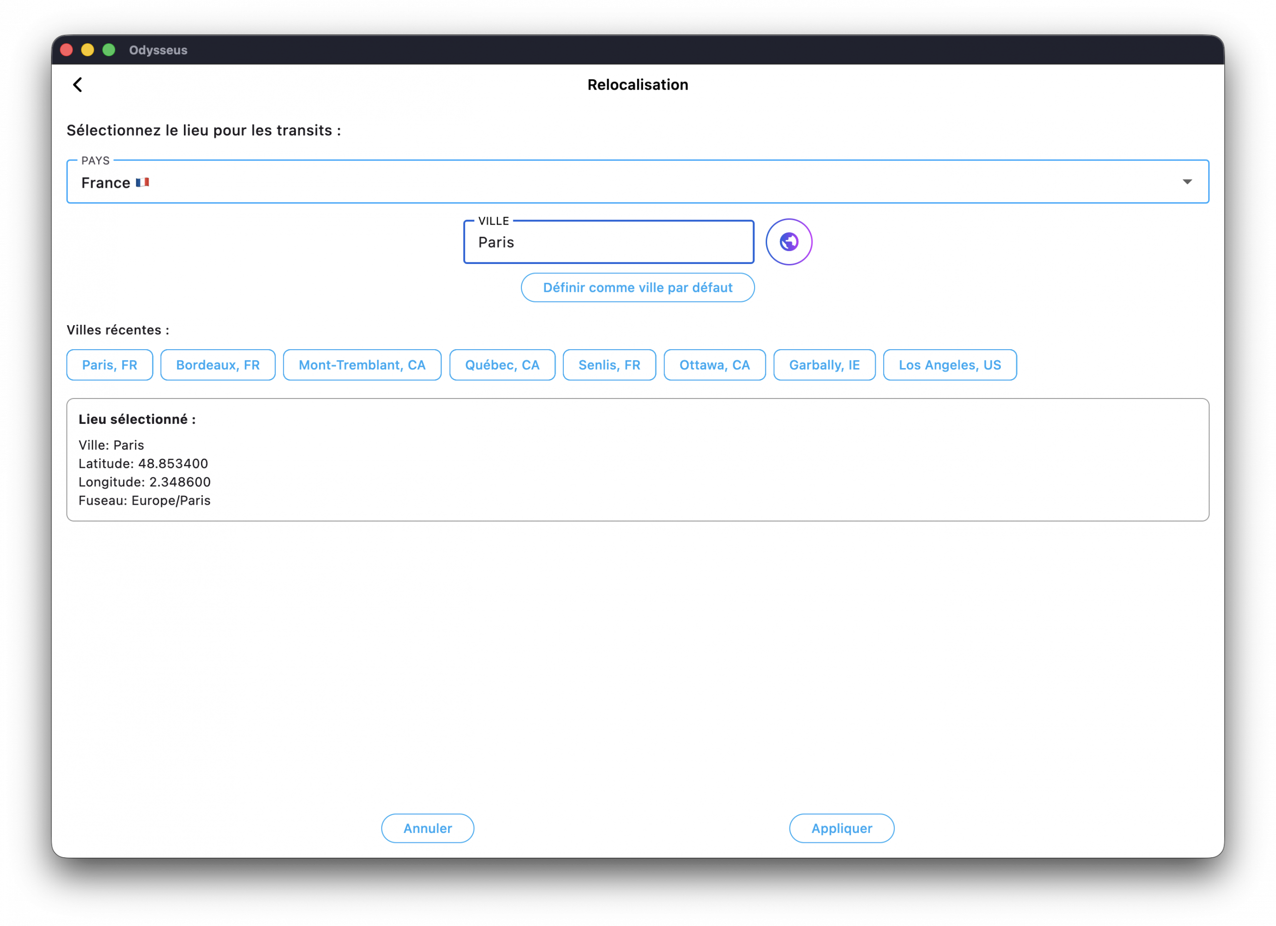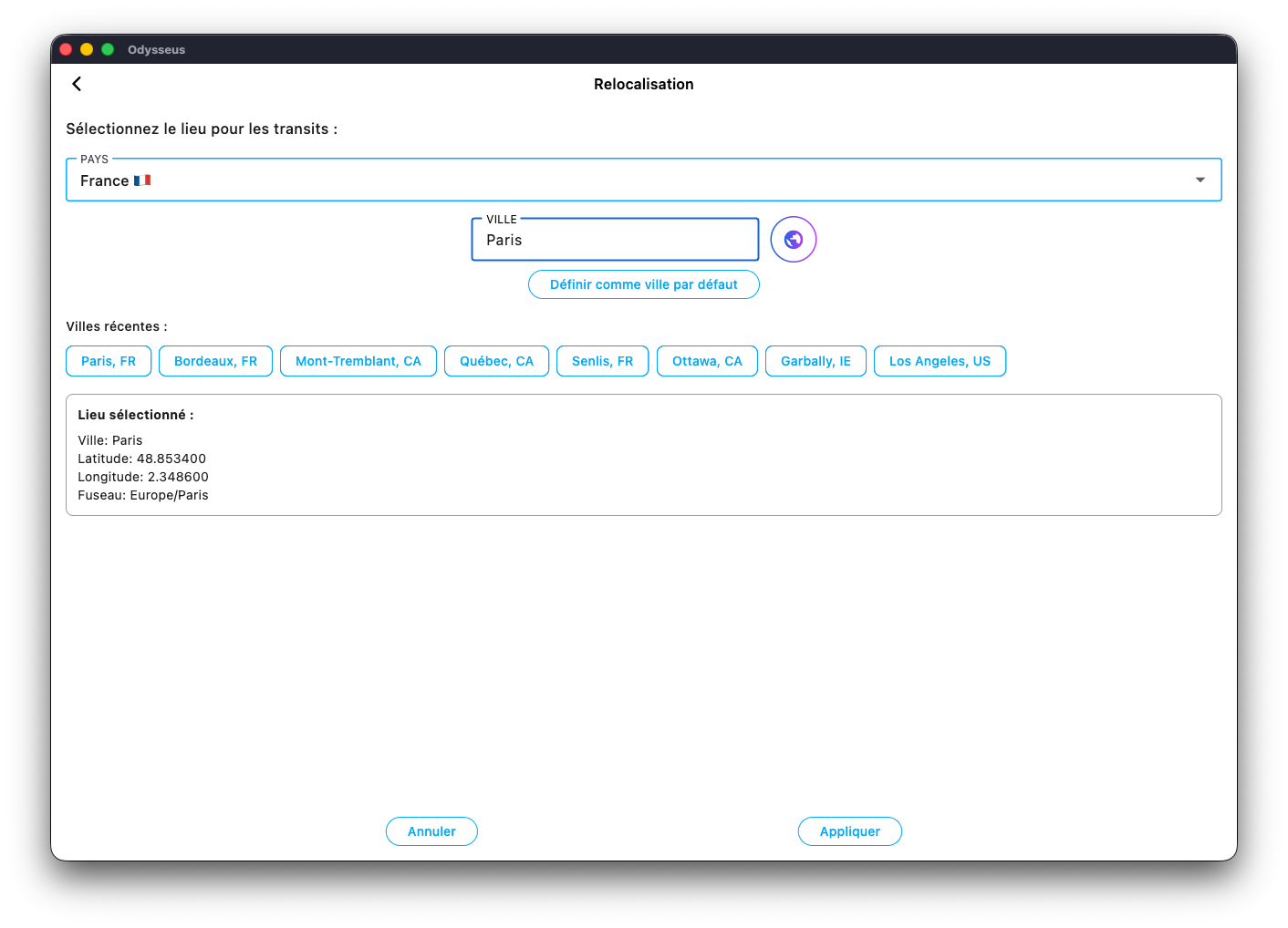 Vous arrivez alors sur un panneau où vous pouvez choisir le pays et la ville, ou bien cliquer sur le globe pour sélectionner directement sur la carte. Puis Appliquer.