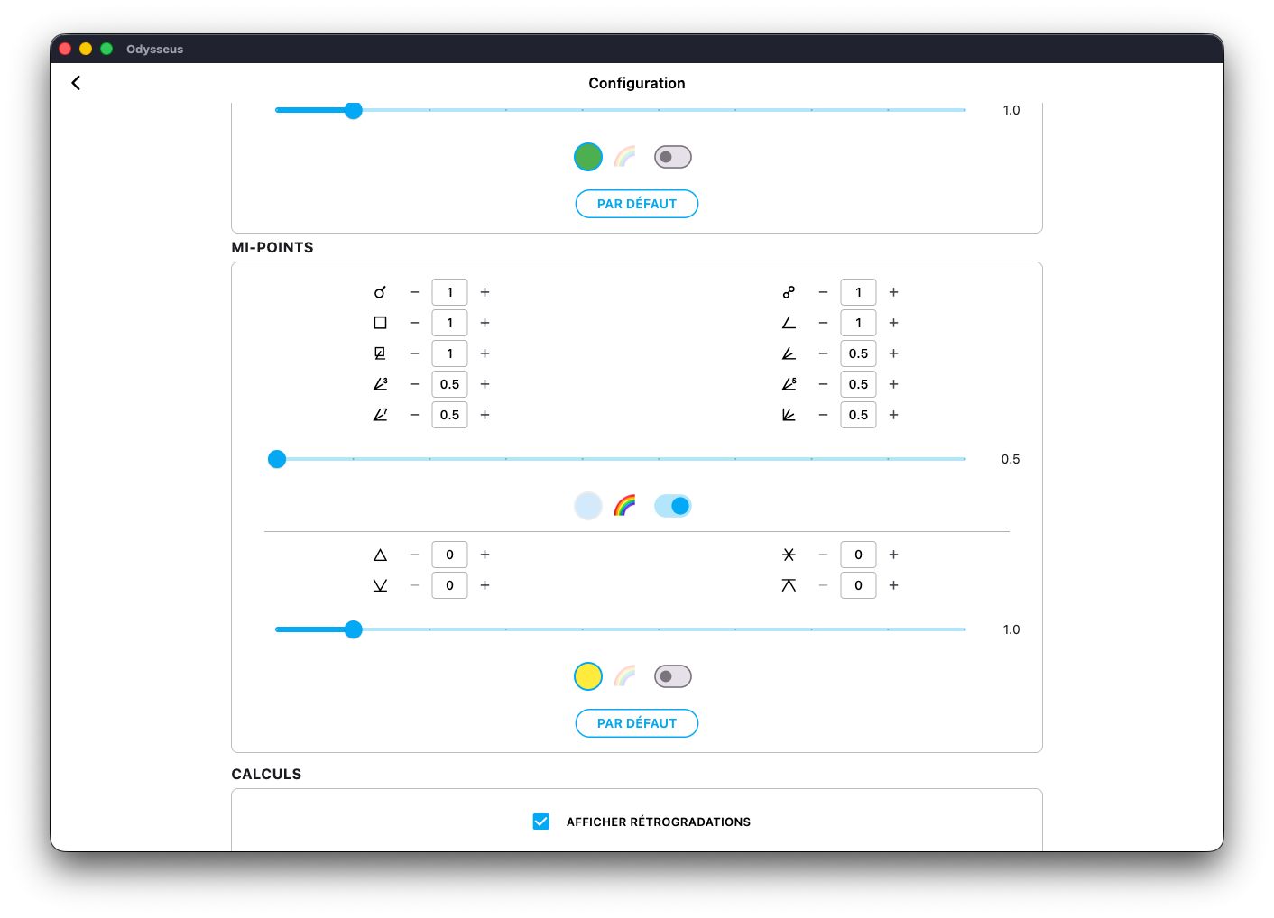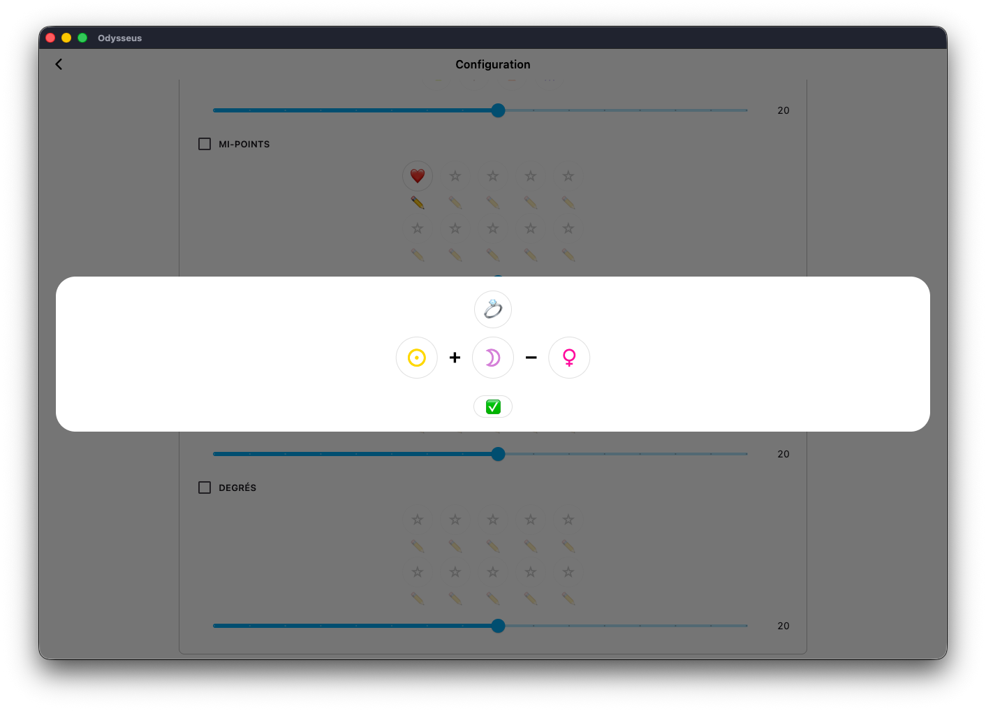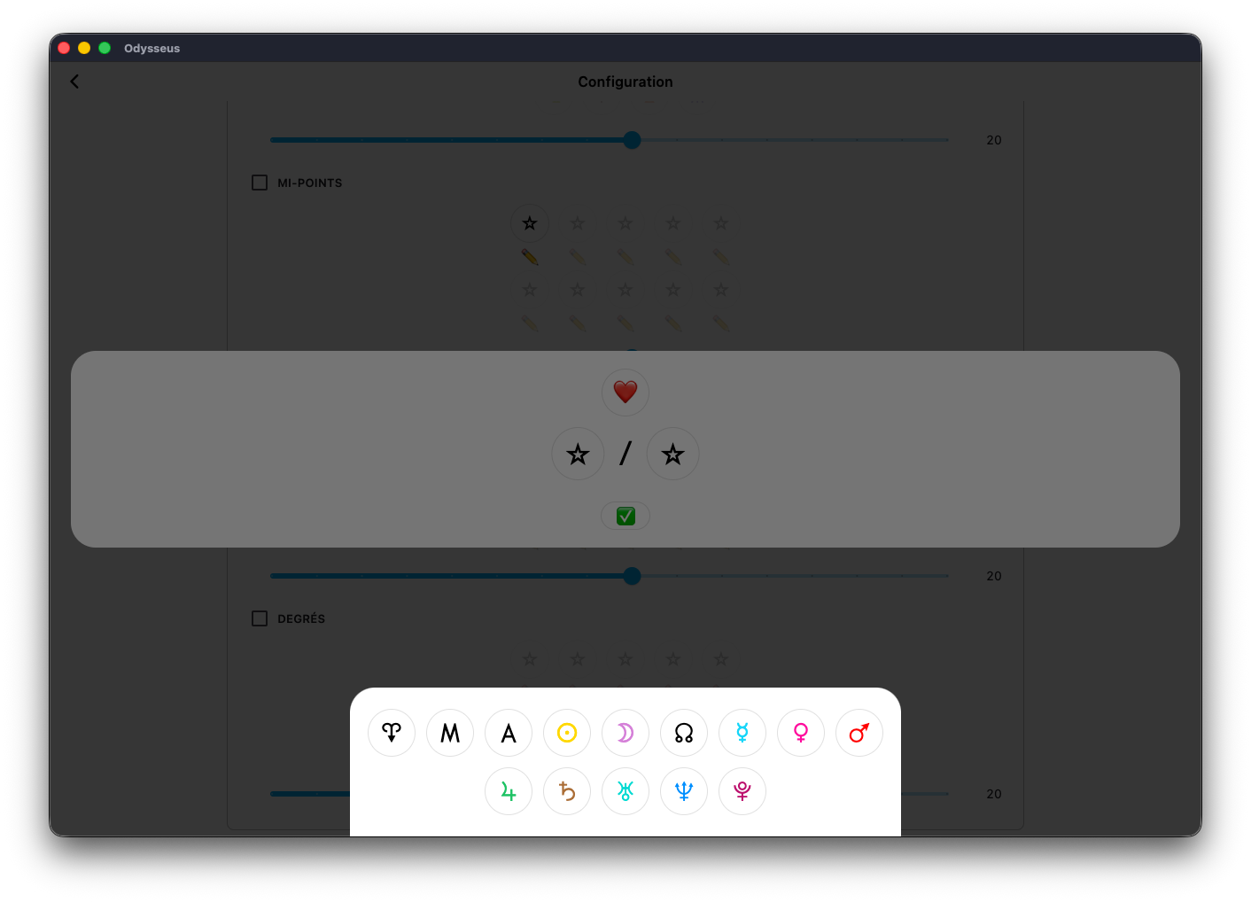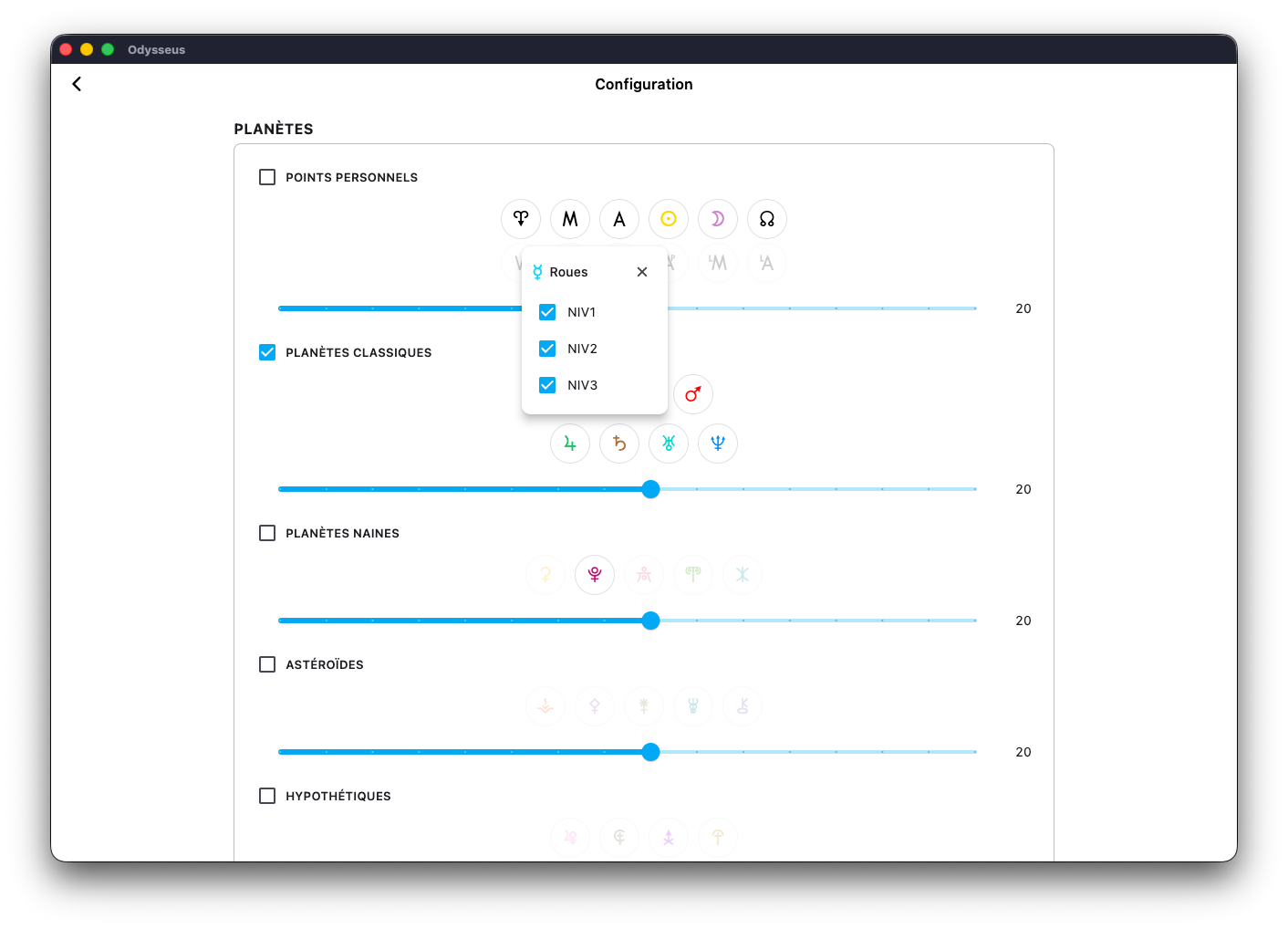Dedans, vous pourrez choisir des planètes à afficher, du niveau sur lequel les afficher (appui long sur le bouton de chaque planète), de leur taille, de la couleur et taille de leurs connecteurs, mais aussi de la couleur et taille des tracés des angles et mi-points, ainsi que quelques autres paramètres.