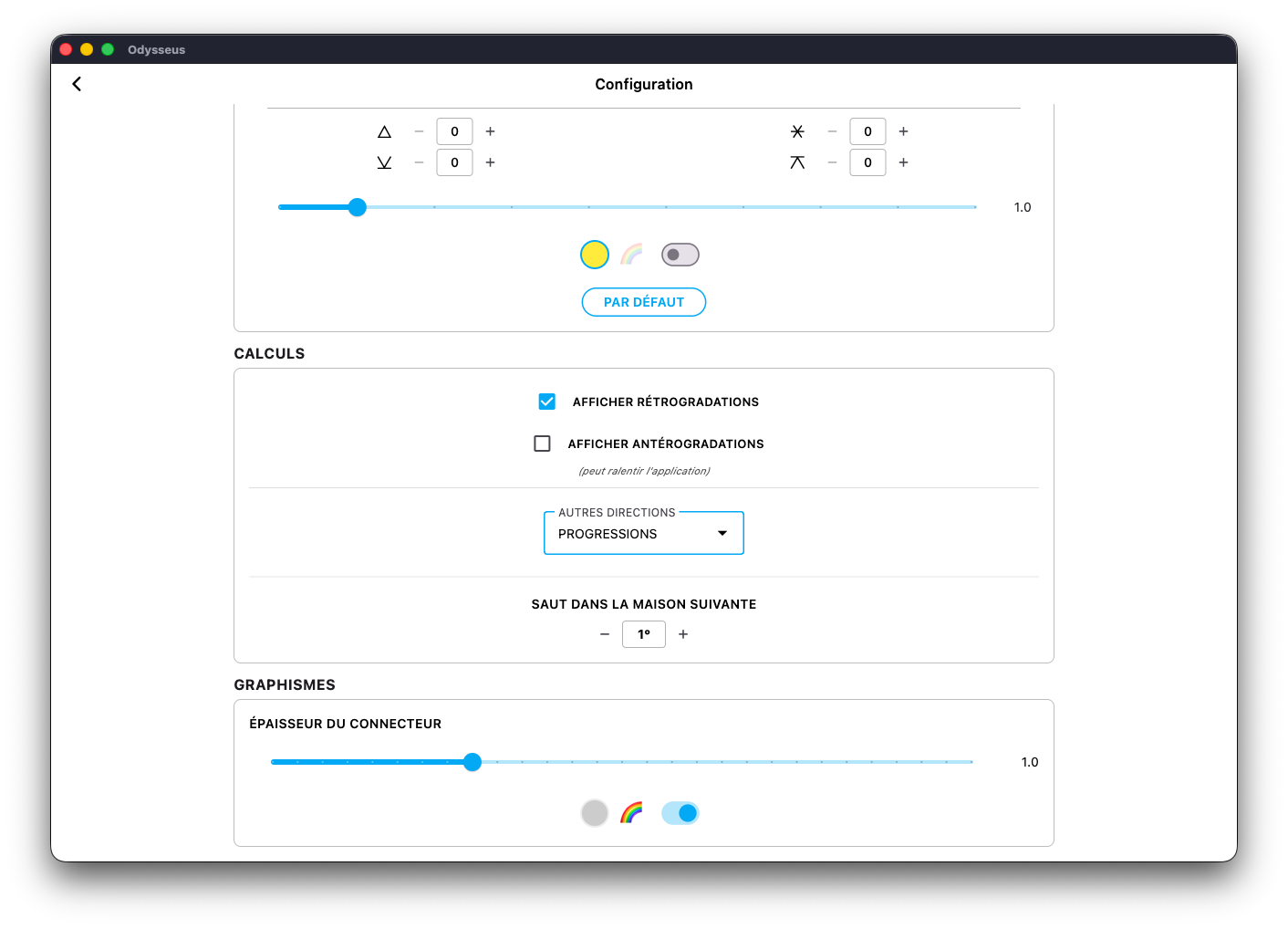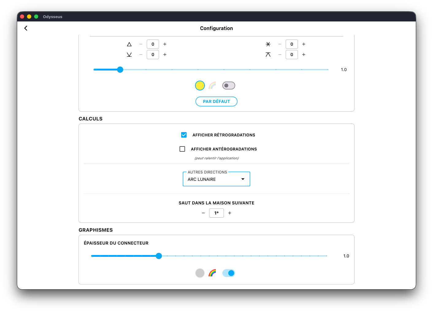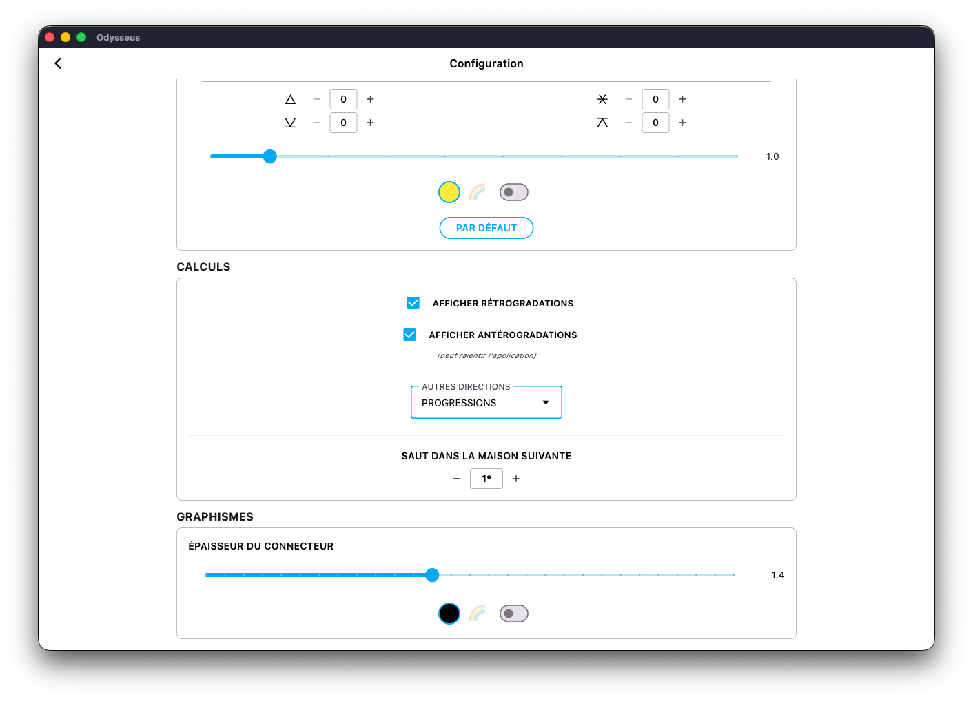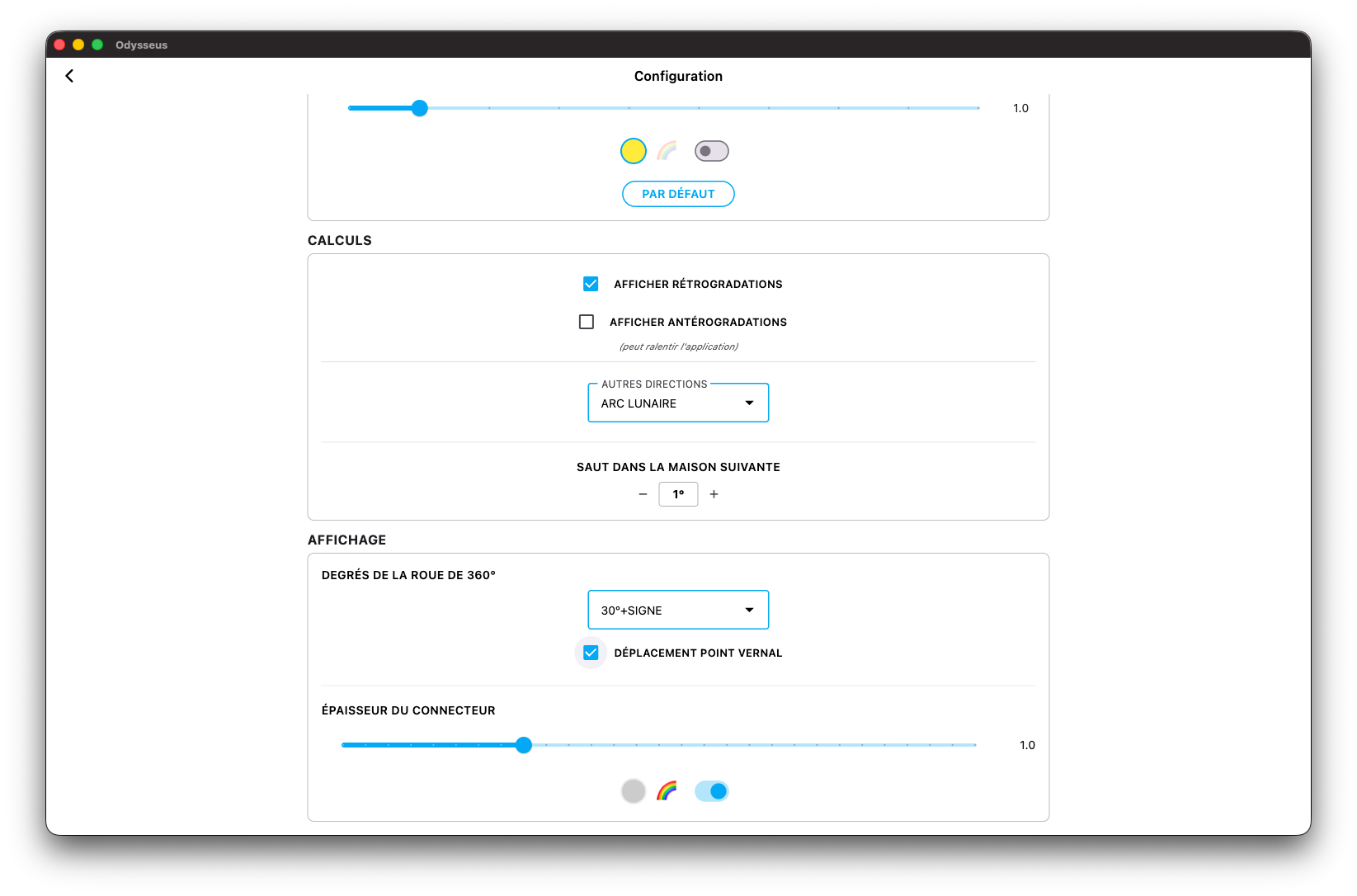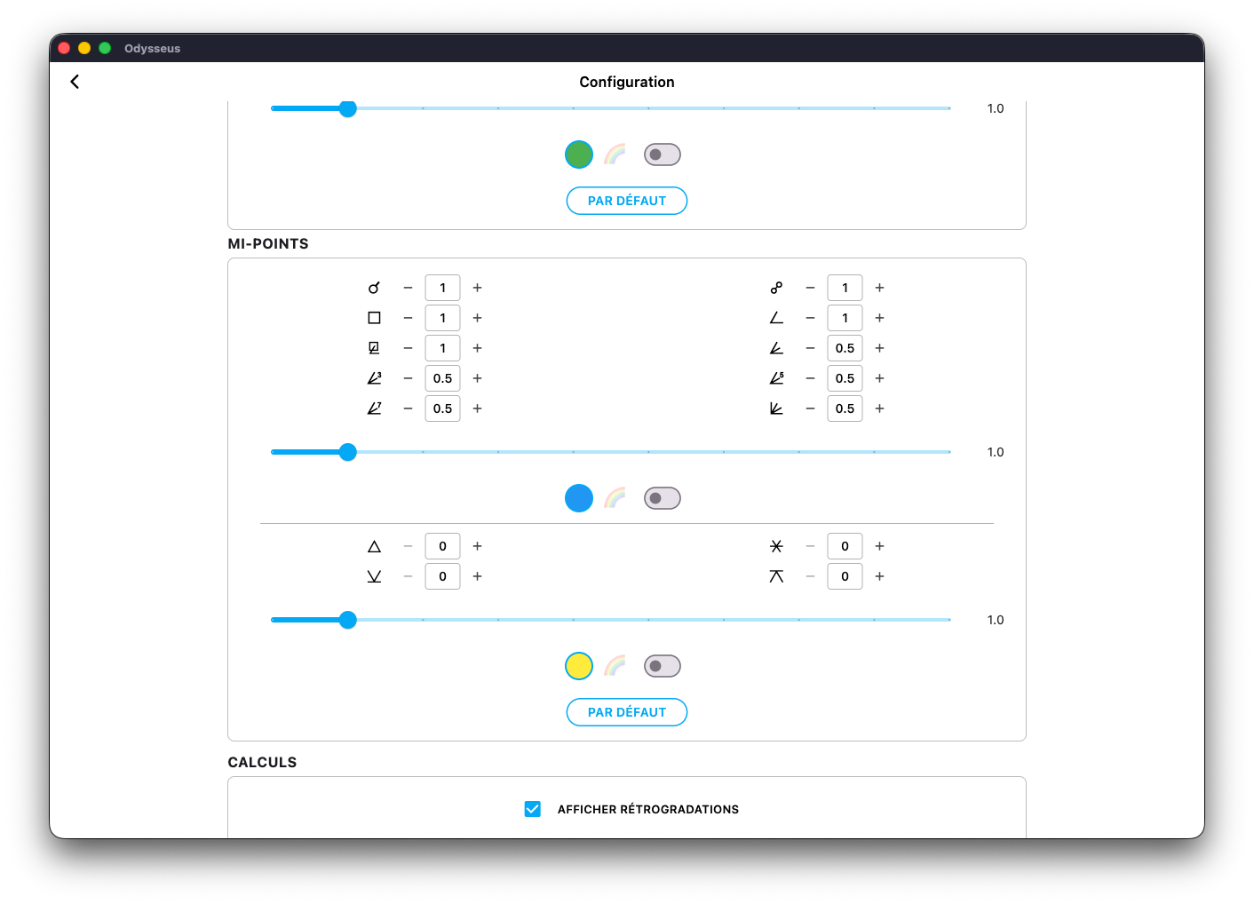 Dedans, vous pourrez choisir des planètes à afficher, du niveau sur lequel les afficher (appui long sur le bouton de chaque planète), de leur taille, de la couleur et taille de leurs connecteurs, mais aussi de la couleur et taille des tracés des angles et mi-points, ainsi que quelques autres paramètres.