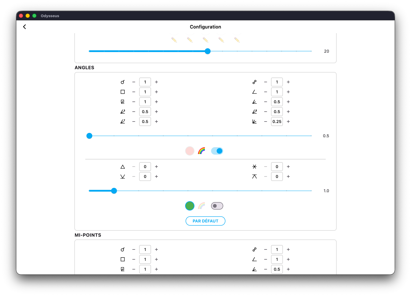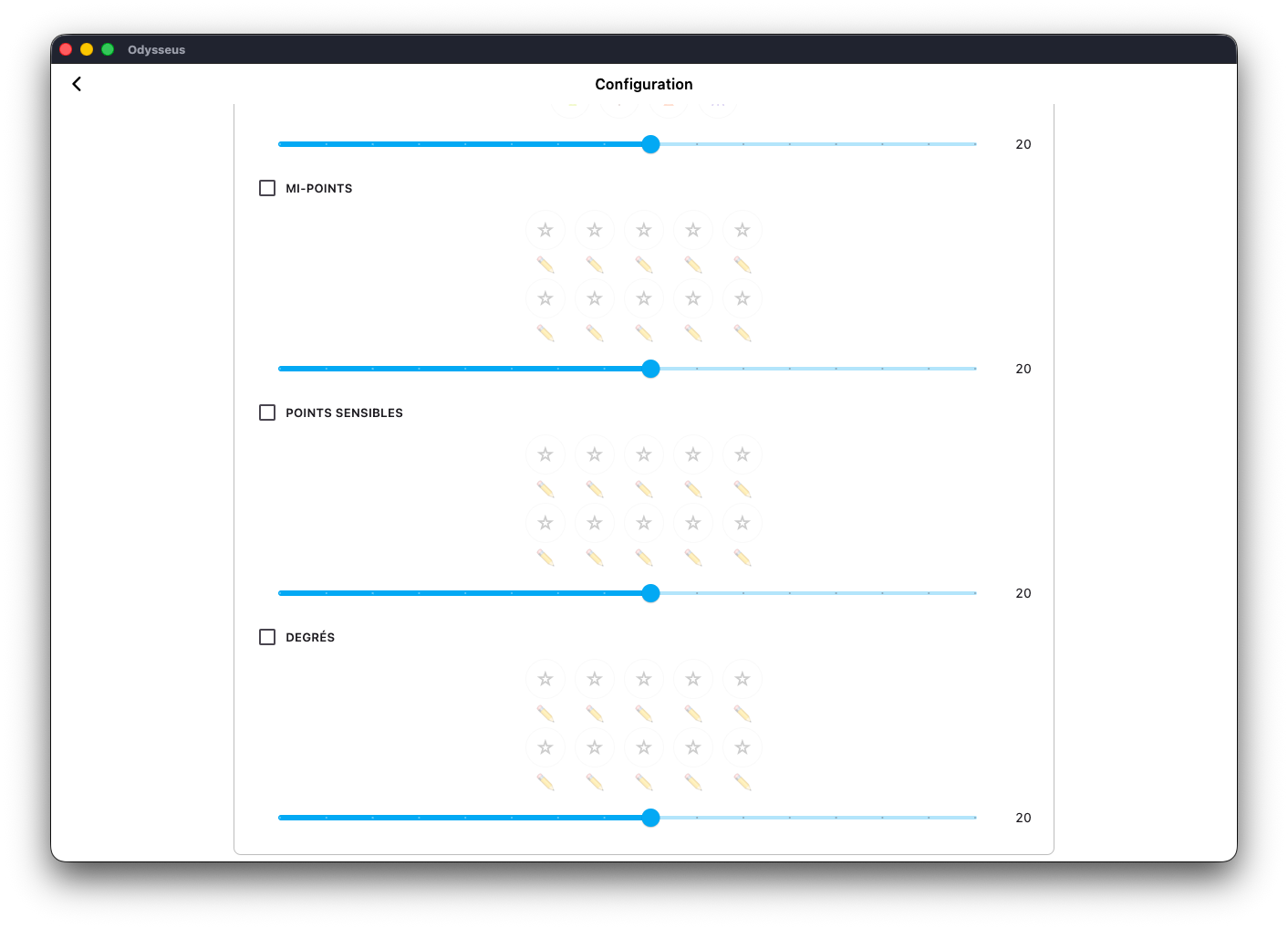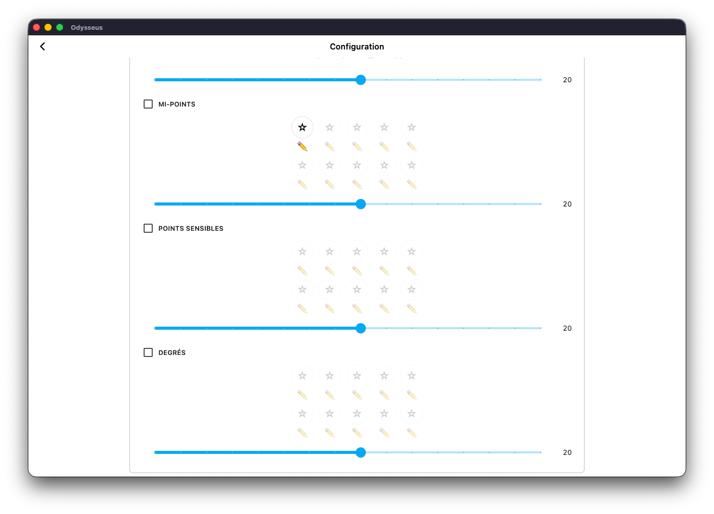 En dessous de ces sections, vous trouverez 3 sous-blocs de 2×5 boutons personnalisables, pour afficher des mi-points, des points sensibles ou des degrés directement sur la roue.