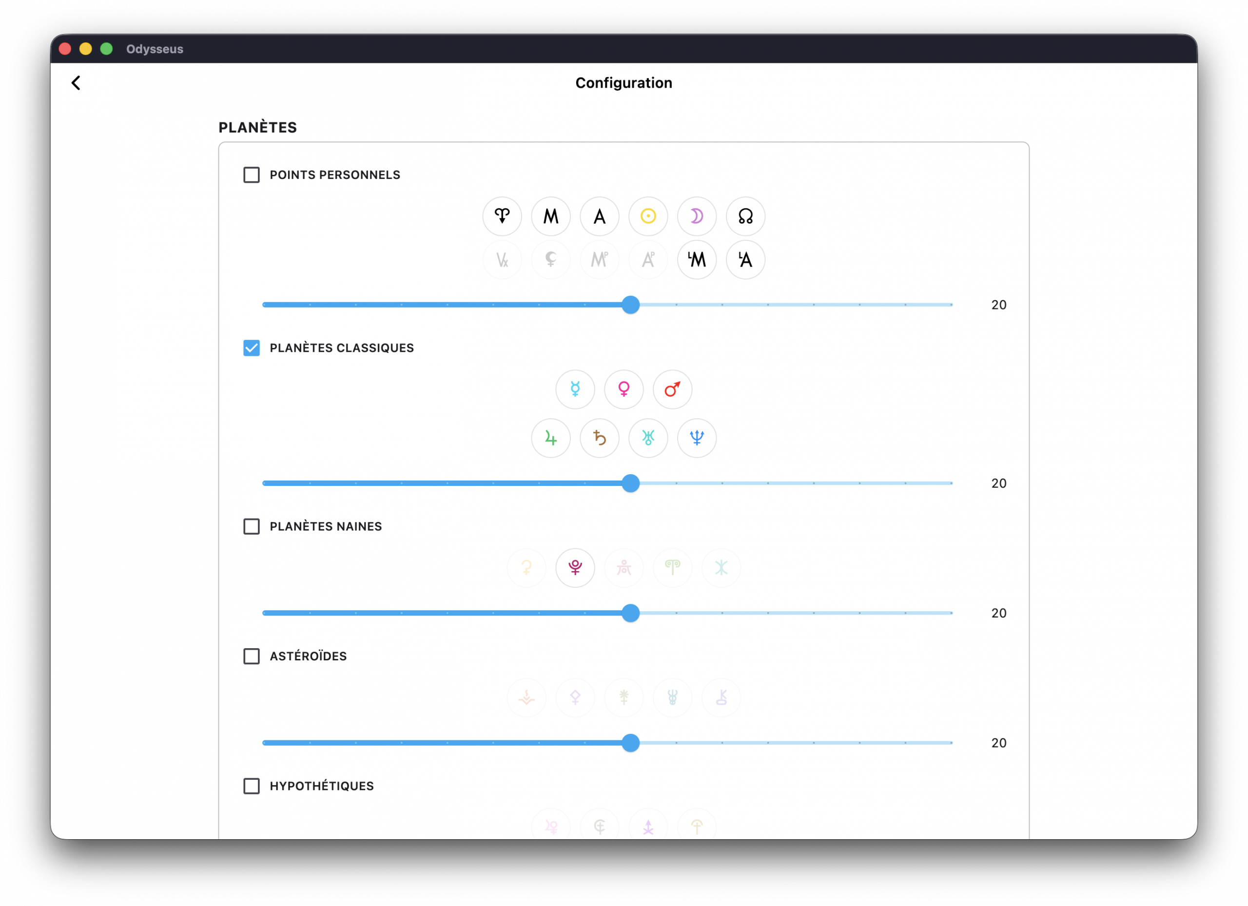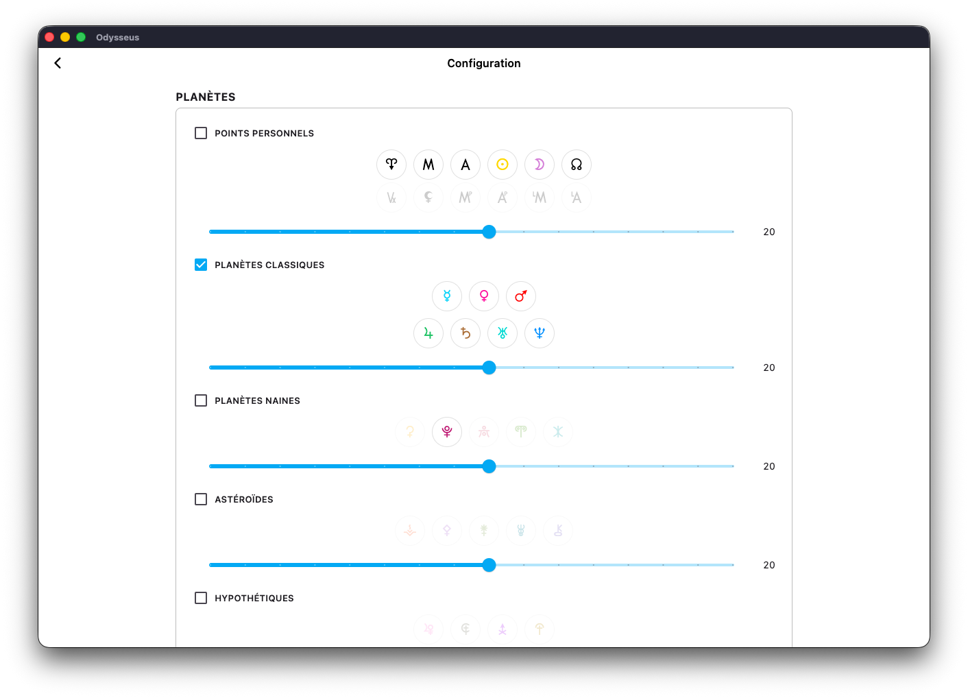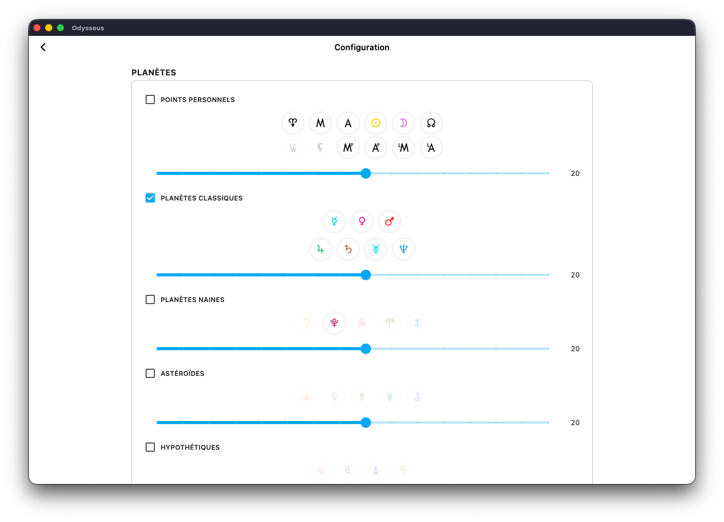 Ces dernières sont rangées en 5 catégories : Points Personnels, planètes classiques, planètes naines, astéroïdes et hypothétiques. Une case cliquable se trouve directement sur la gauche du titre de chaque section pour vous permettre de toutes les afficher d’un coup ou de toutes les désélectionner d’un coup.