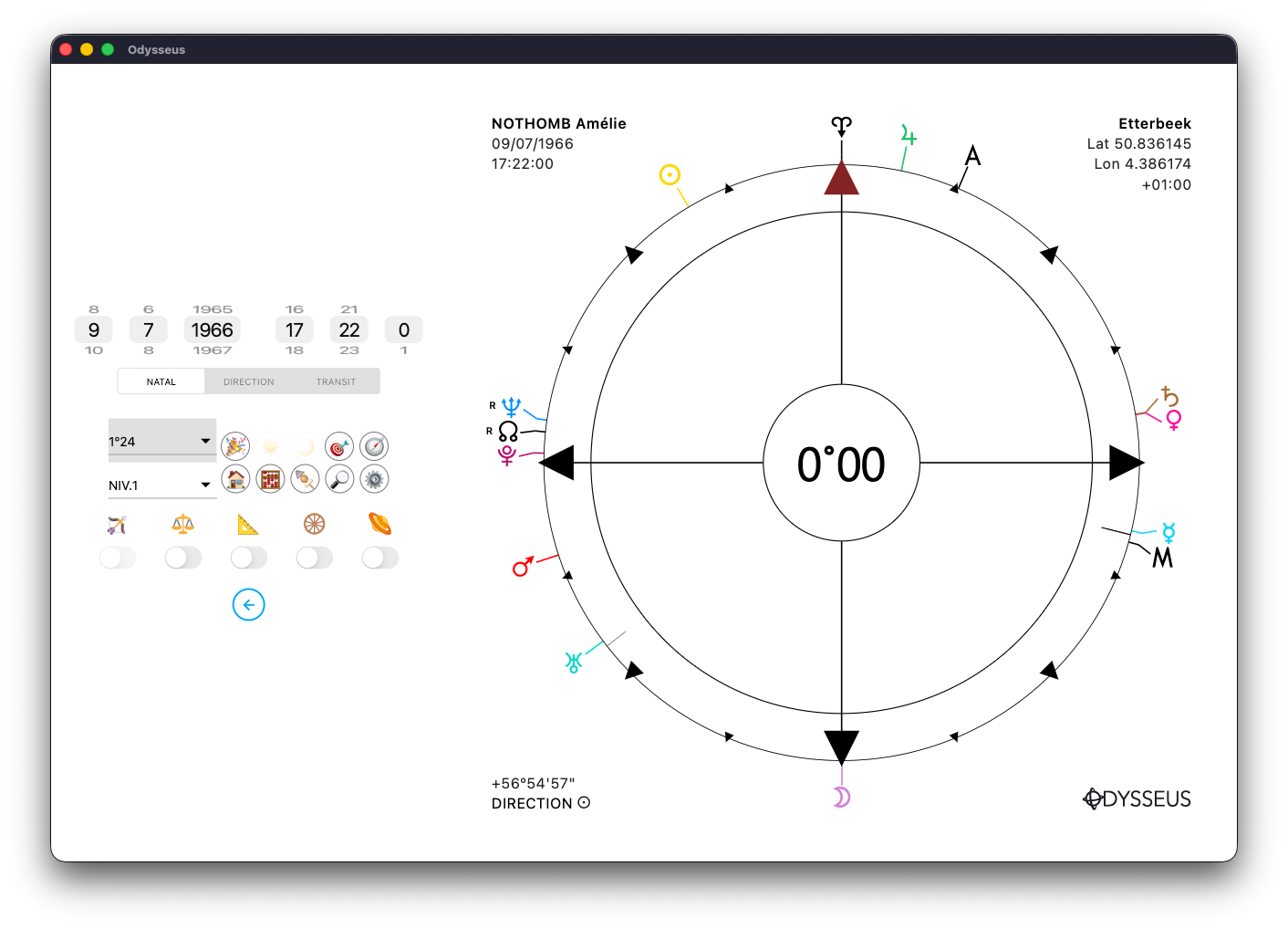 L’affichage d’une carte se présente ainsi : une carte du ciel, des molettes de date et heure, un curseur de niveau (natal, direction, transit), des menus de roue et de niveaux, 10 boutons et 5 interrupteurs.