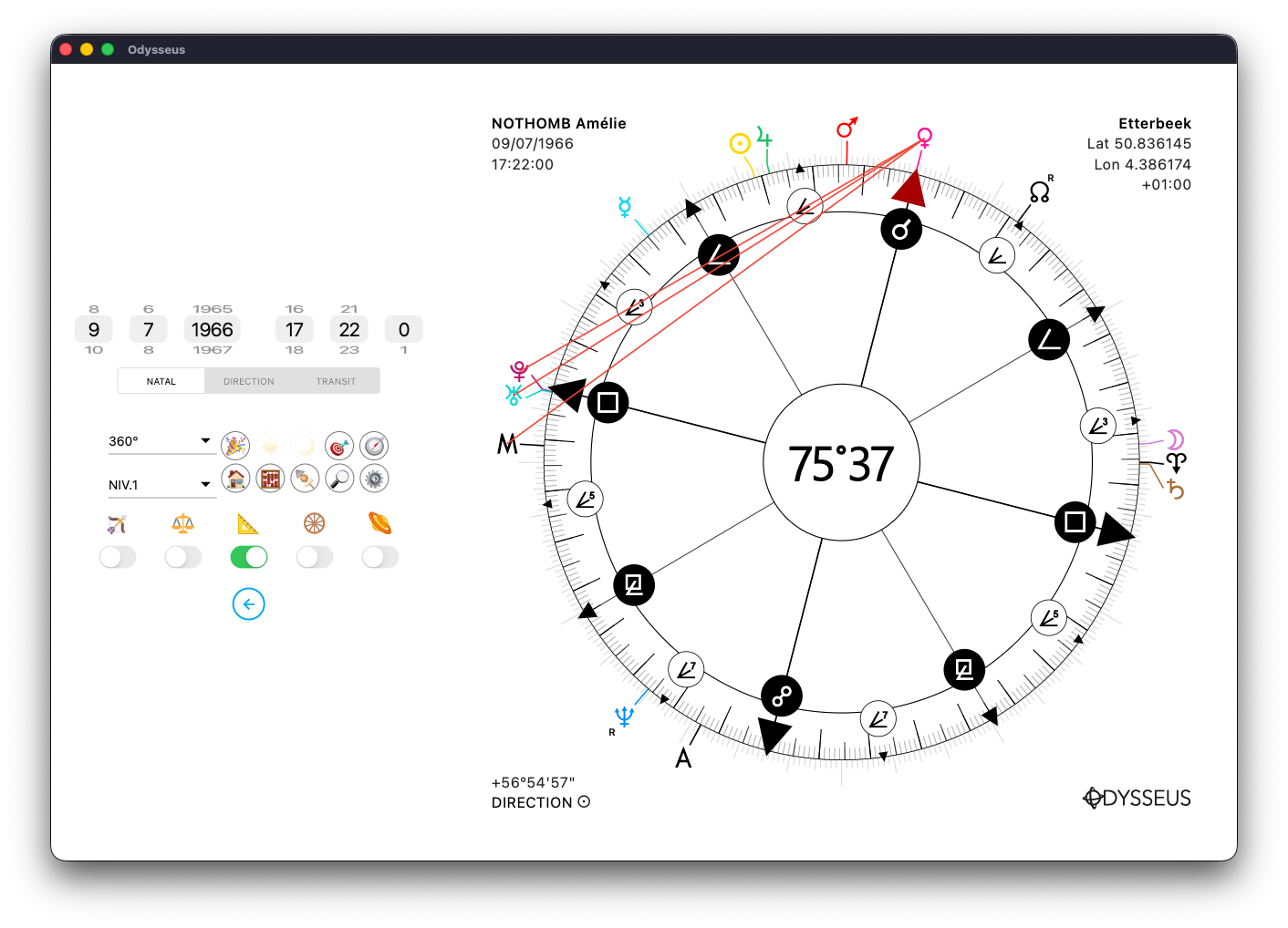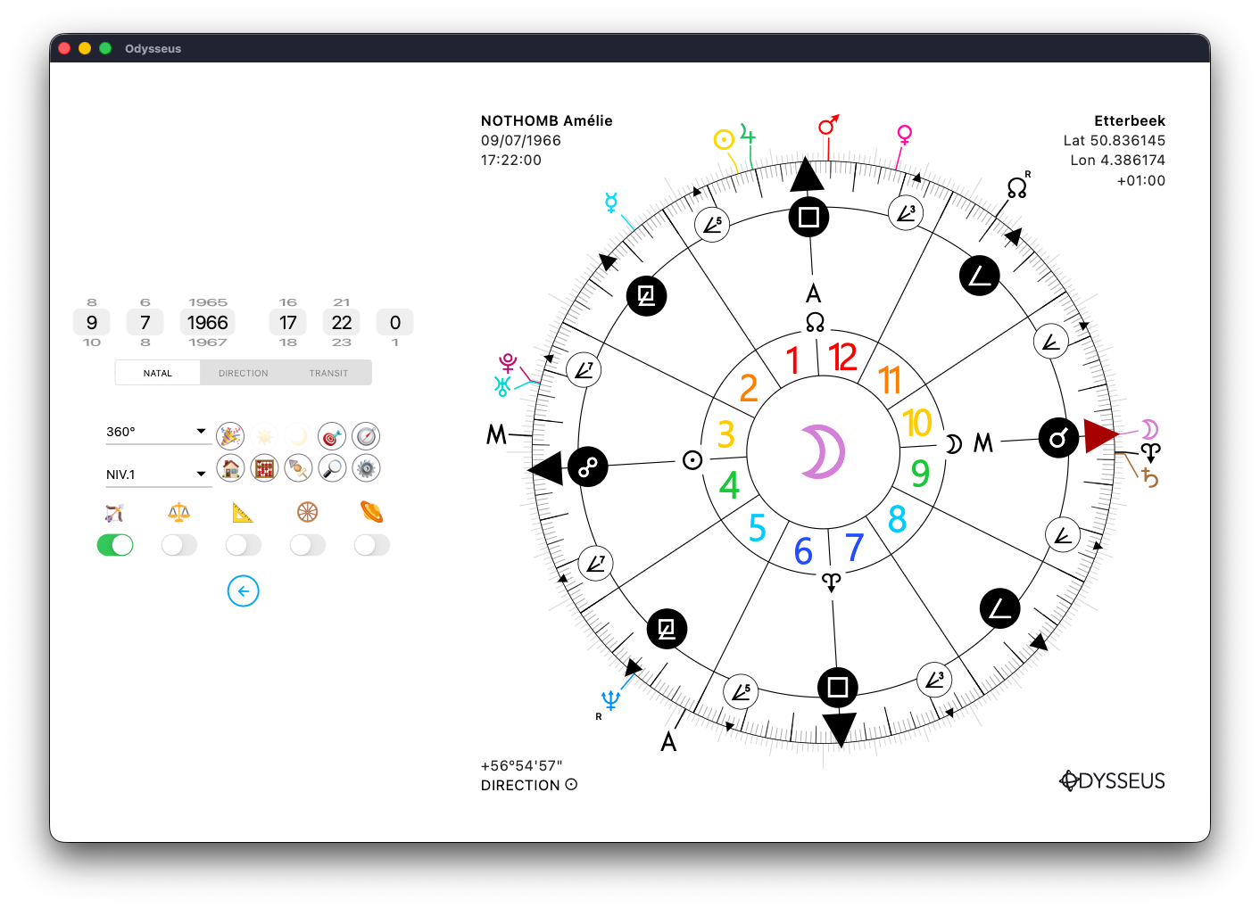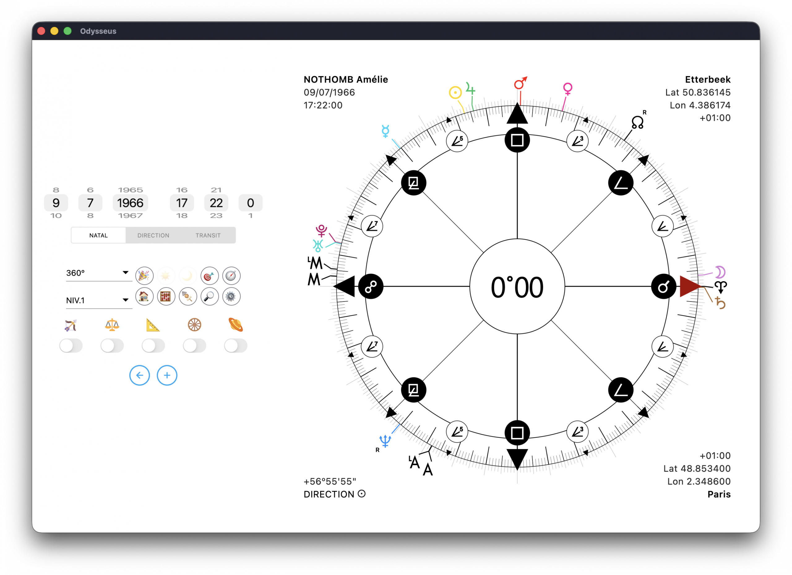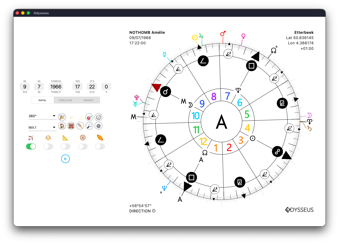 Ils apparaitront alors sur la carte aux niveaux 1 et 2 (alors que sur le niveau 3, la relocalisation fera simplement changer le Milieu du Ciel < et l’Ascendant > classiques), plus ou moins proches de ceux de naissance selon la destination choisie. Ici, sur le thème d’Amélie Nothomb, comme la ville choisie était Paris alors que l’autrice est née à Etterbeek en Belgique, la distance n’est pas grande, donc l’écart entre les facteurs de naissance et ceux relocalisés est faible.
