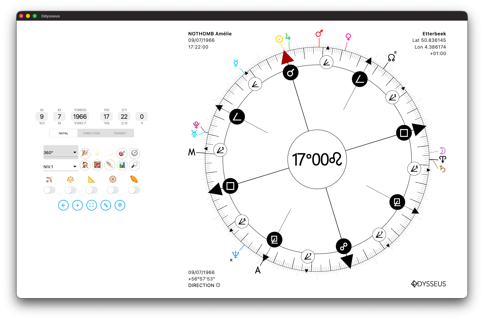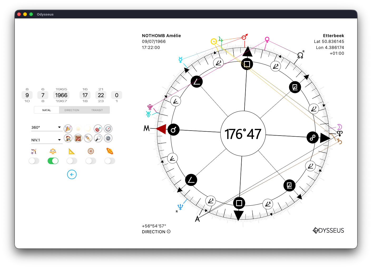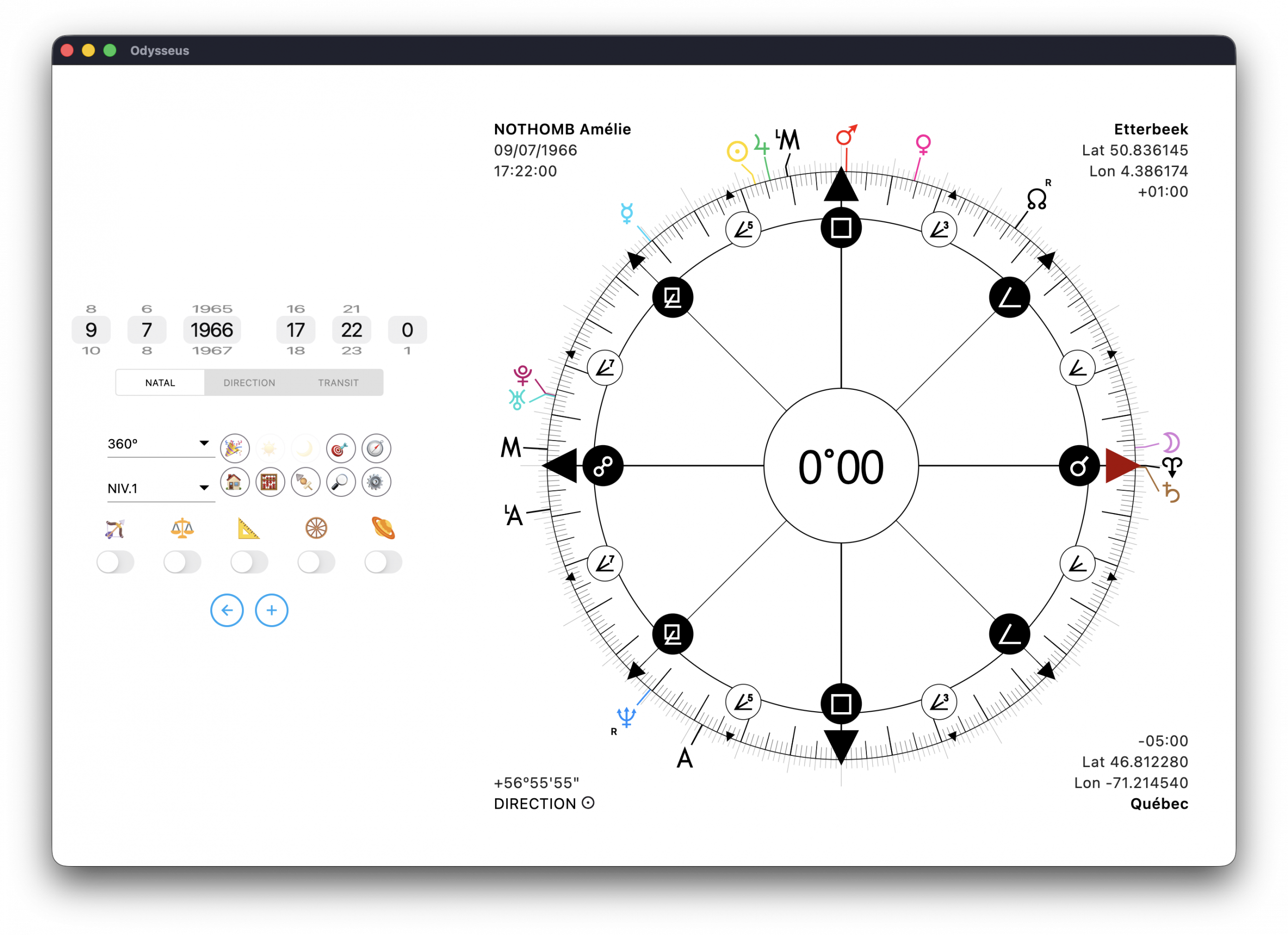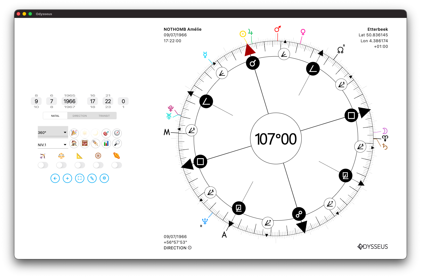 Ils apparaitront alors sur la carte aux niveaux 1 et 2 (alors que sur le niveau 3, la relocalisation fera simplement changer le Milieu du Ciel < et l’Ascendant > classiques), plus ou moins proches de ceux de naissance selon la destination choisie. Ici, sur le thème d’Amélie Nothomb, comme la ville choisie était Paris alors que l’autrice est née à Etterbeek en Belgique, la distance n’est pas grande, donc l’écart entre les facteurs de naissance et ceux relocalisés est faible.