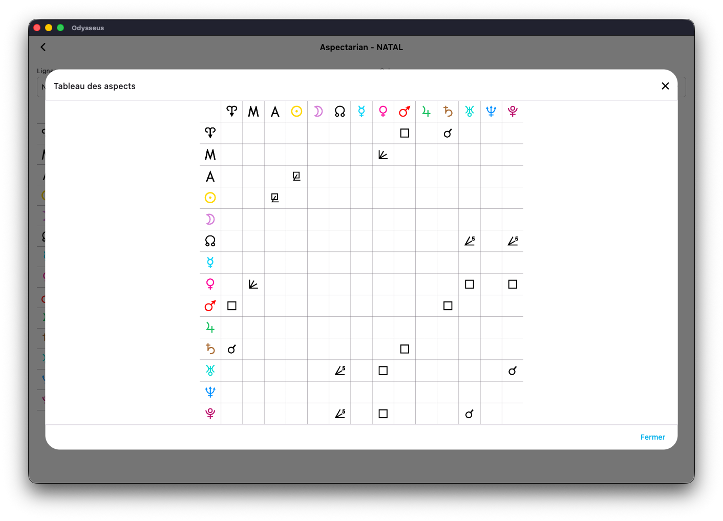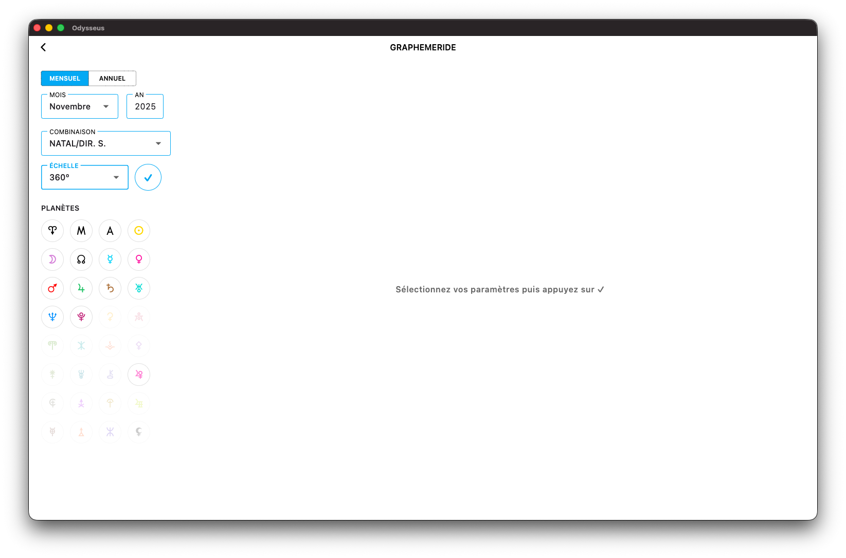En faisant un clic long sur le bouton graphique 📊, vous accéderez au « Graphéméride », le générateur d’éphémérides graphiques pour votre thème :