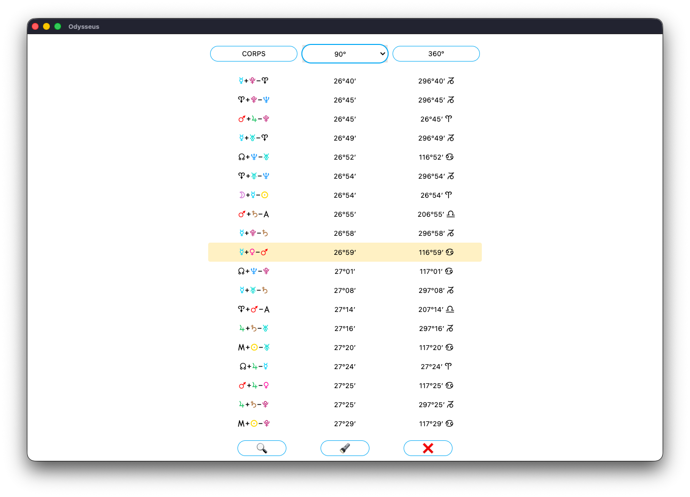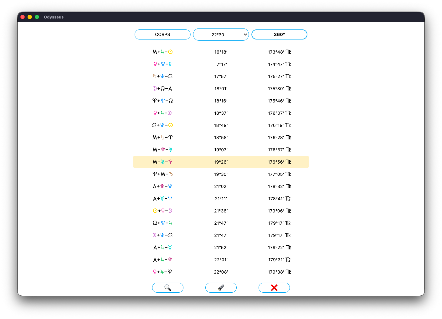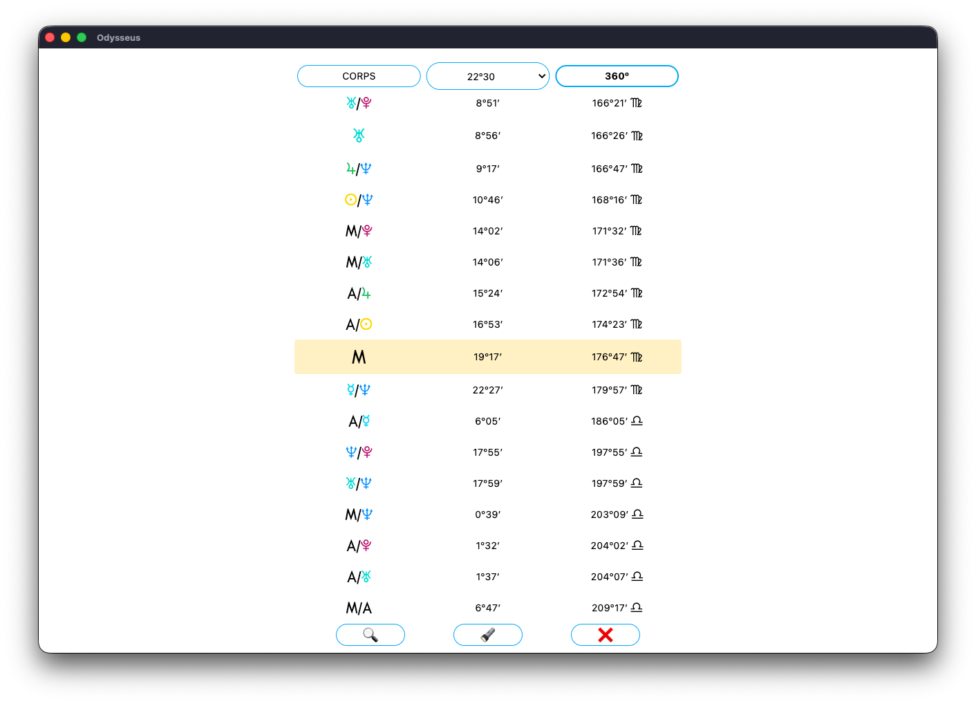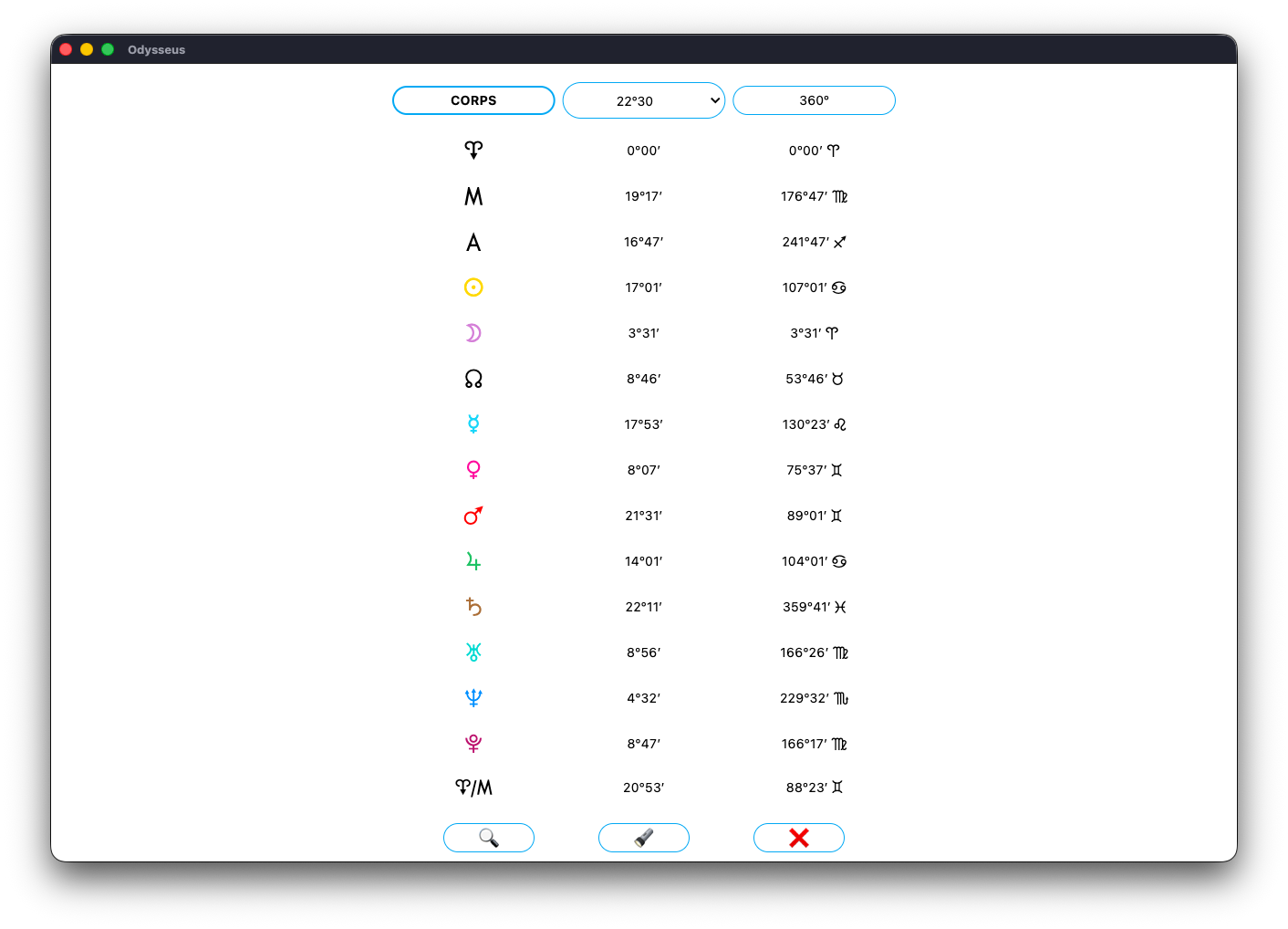 On trouve alors la liste des 22 points traditionnellement utilisées : le Point Vernal A, le Milieu du Ciel <, l’Ascendant >, le Soleil N, la Lune Y, le Nœud Lunaire W, Mercure O, Vénus P, Mars Q, Jupiter R, Saturne S, Uranus T, Neptune U, Pluton V, Cupidon a, Hades b, Zeus c, Kronos d, Apollon e, Admète f, Vulcain g, Poseidon h.