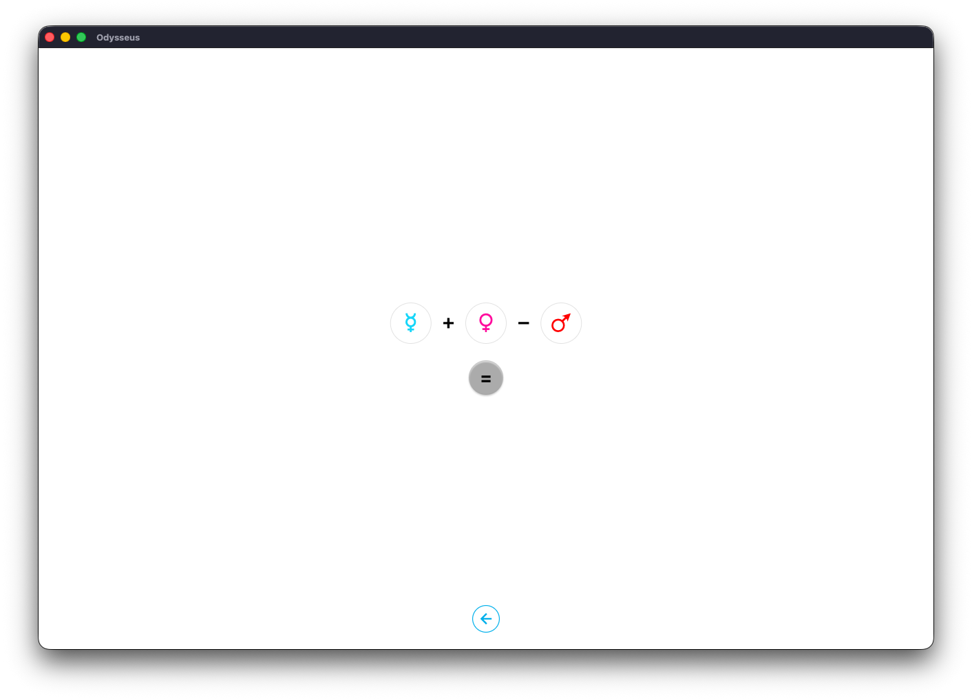 L’écran dispose 3 boutons : une planète A (à gauche), une planète B (à droite), et le bouton = pour obtenir la définition.