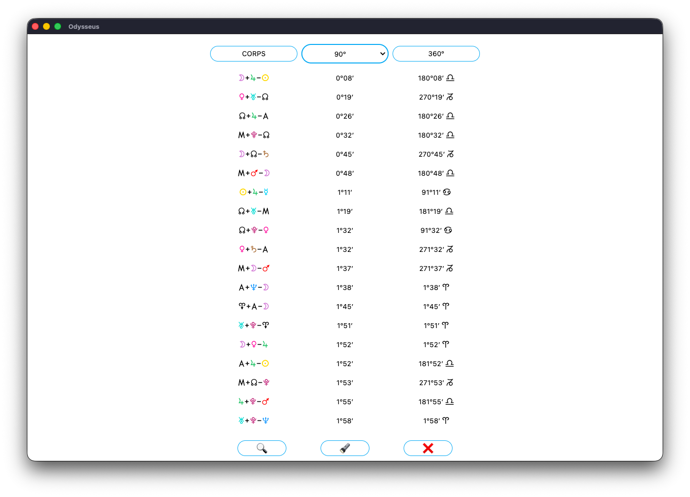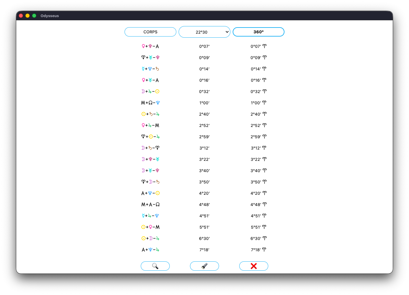 Cet outil permet de rechercher les « symétries d’axe ». Dans l’avenir, une prochaine version sera mise en ligne présentant une fonction automatique permettant de savoir s’il existe une symétrie d’axe de planètes, mi-points ou points sensibles. Pour l’instant, il faut la chercher soi-même.