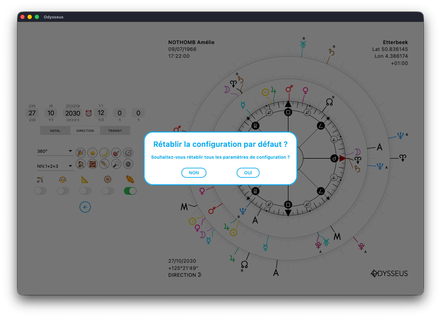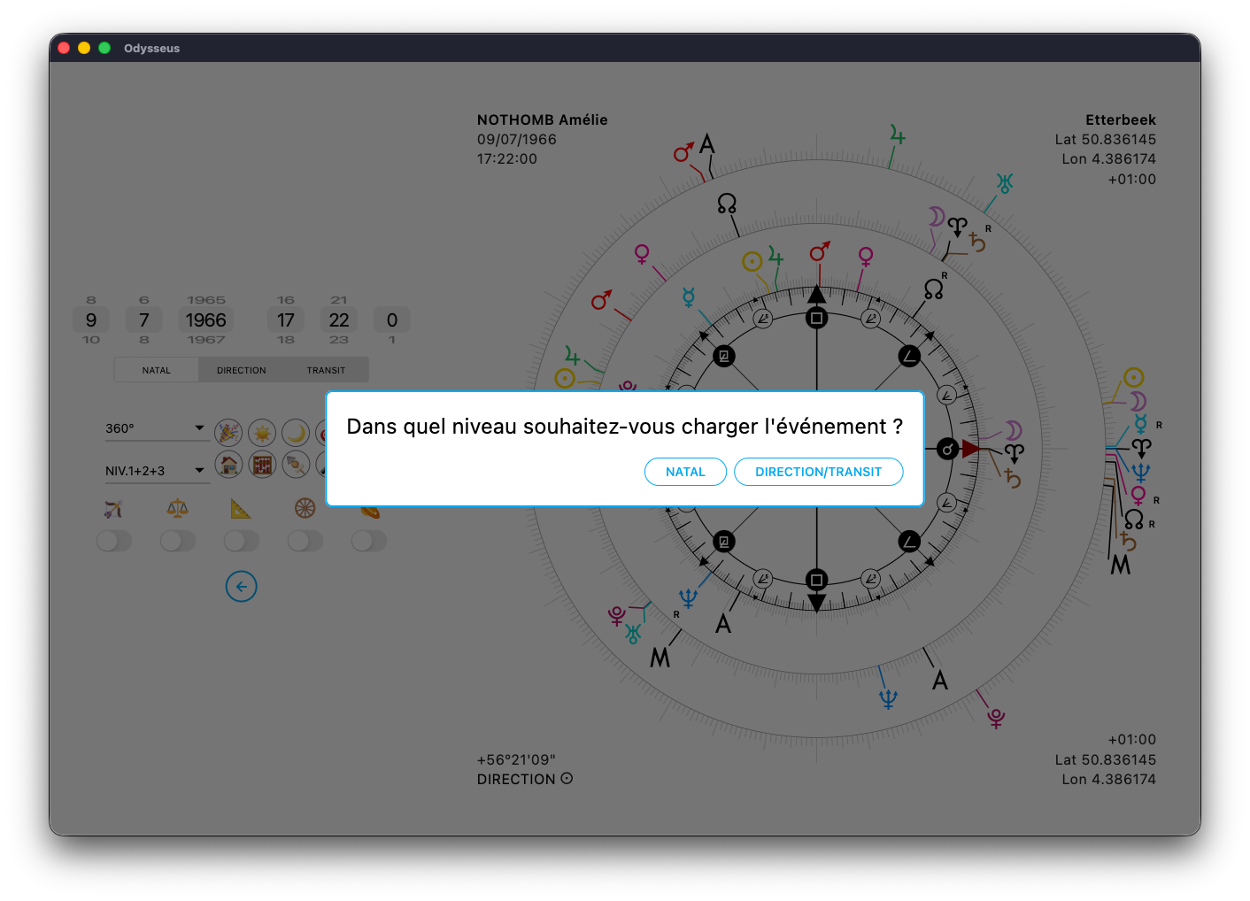 L’application vous demandera si vous voulez vraiment charger cet évènement sur le niveau natal (ce qui remplacera les données du thème) ou bien sur le niveau 2/3. Si vous analysez le thème d’un individu, choisissez toujours de charger l’évènement en DIRECTION/TRANSIT.