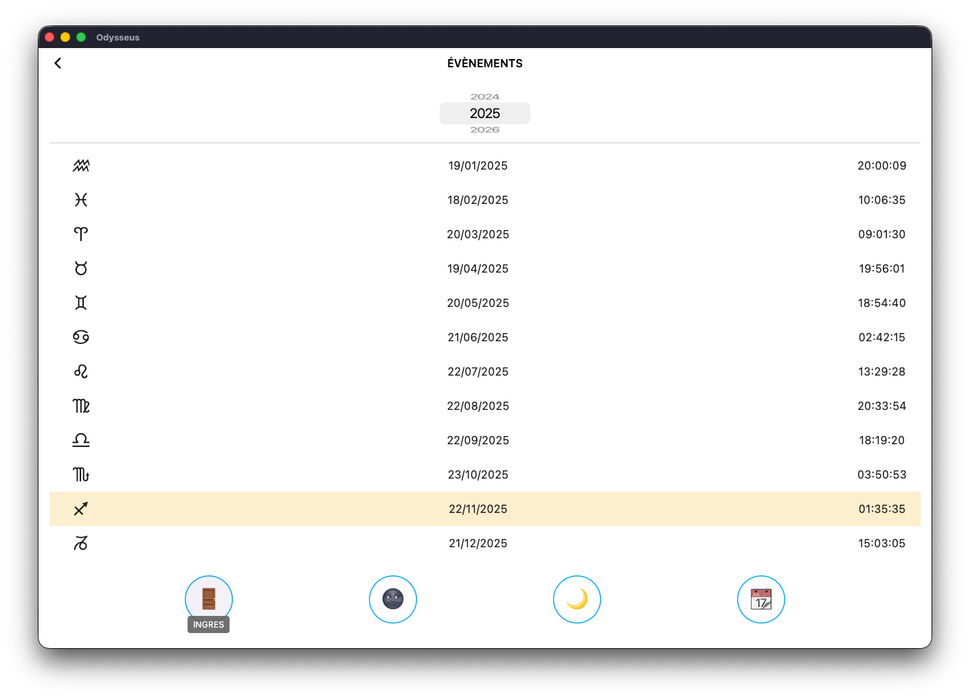 Il est courant en astrologie d’avoir besoin de charger des dates d’évènements célestes spécifiques. Pour cela, faites usage du bouton festif 🎉