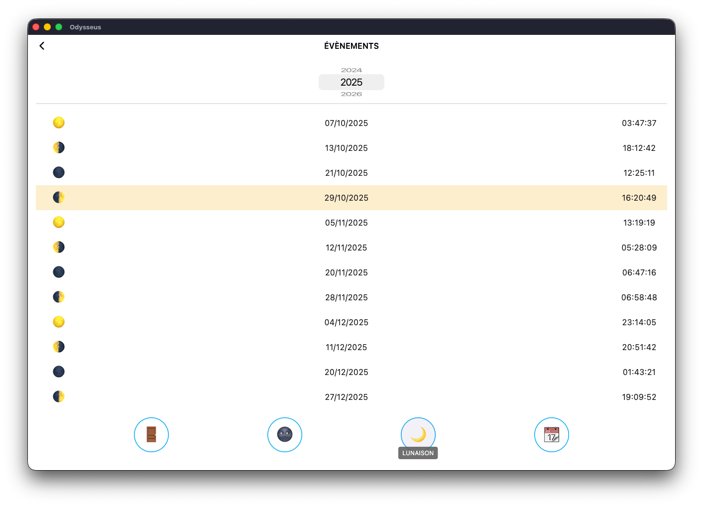 …permet de charger les lunaisons de l’année en cours. Attention, cela peut prendre un peu de temps car les lunaisons sont nombreuses au cours d’une année. Vous remarquerez qu’à chaque fois, le prochain évènement en date à venir est toujours surligné en jaune.