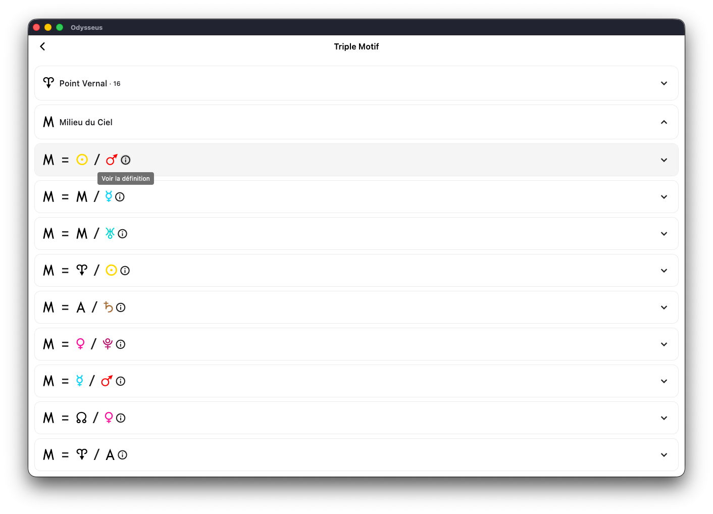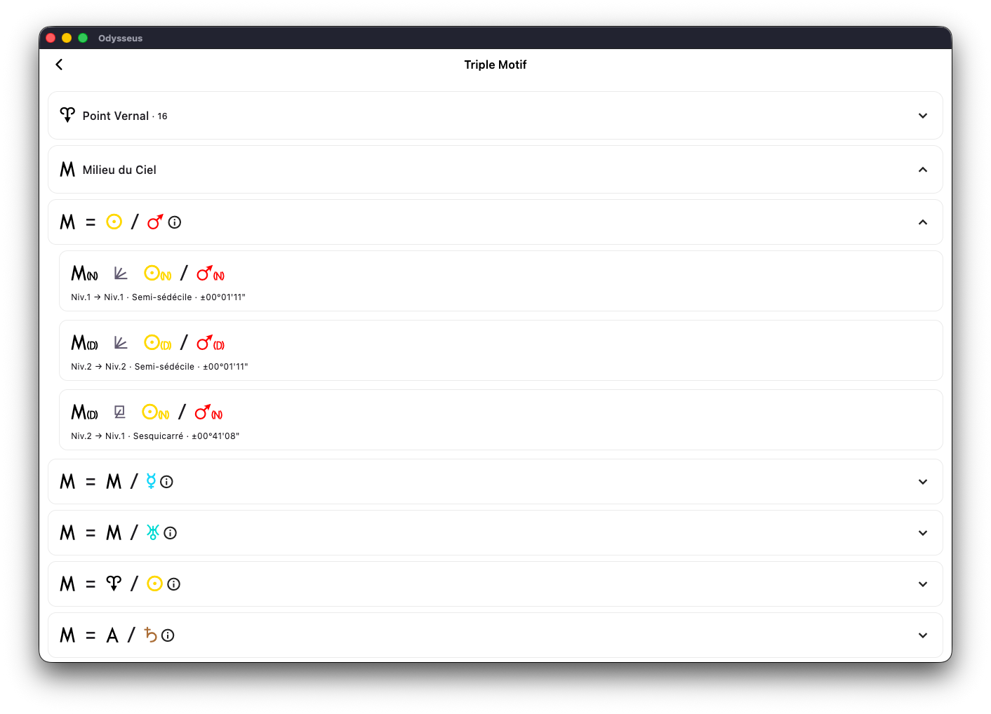 Ainsi, le panneau de Triple Motif permet de voir toutes les occurrences d’une planète sur un mi-point lorsque cela se produit au moins trois fois :