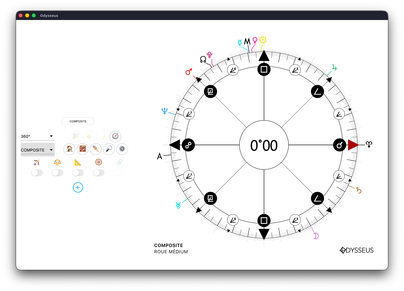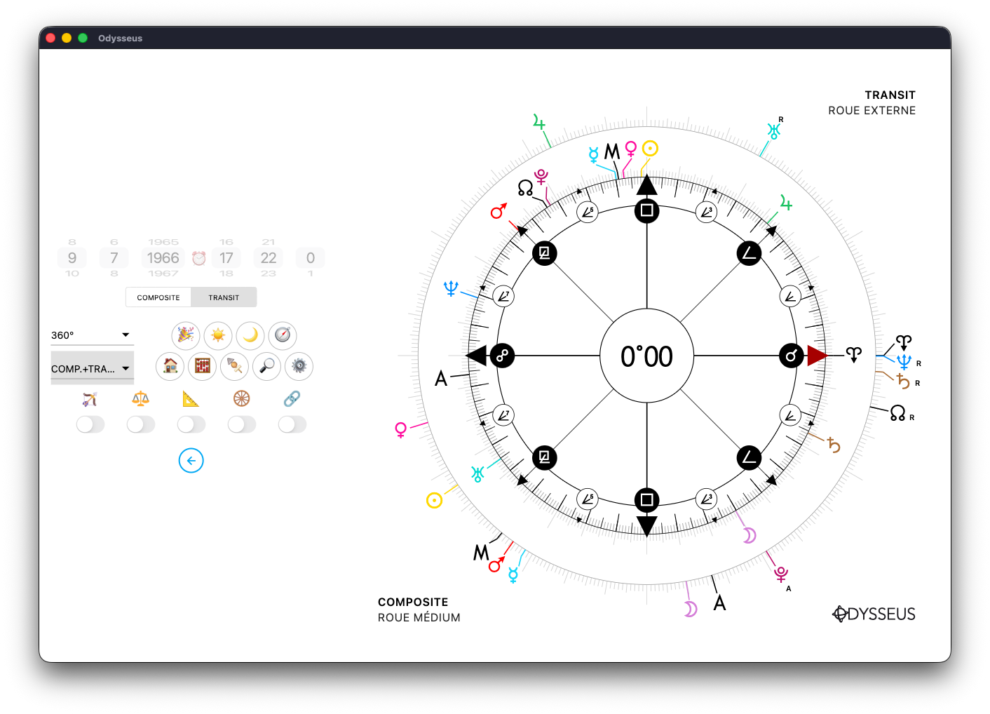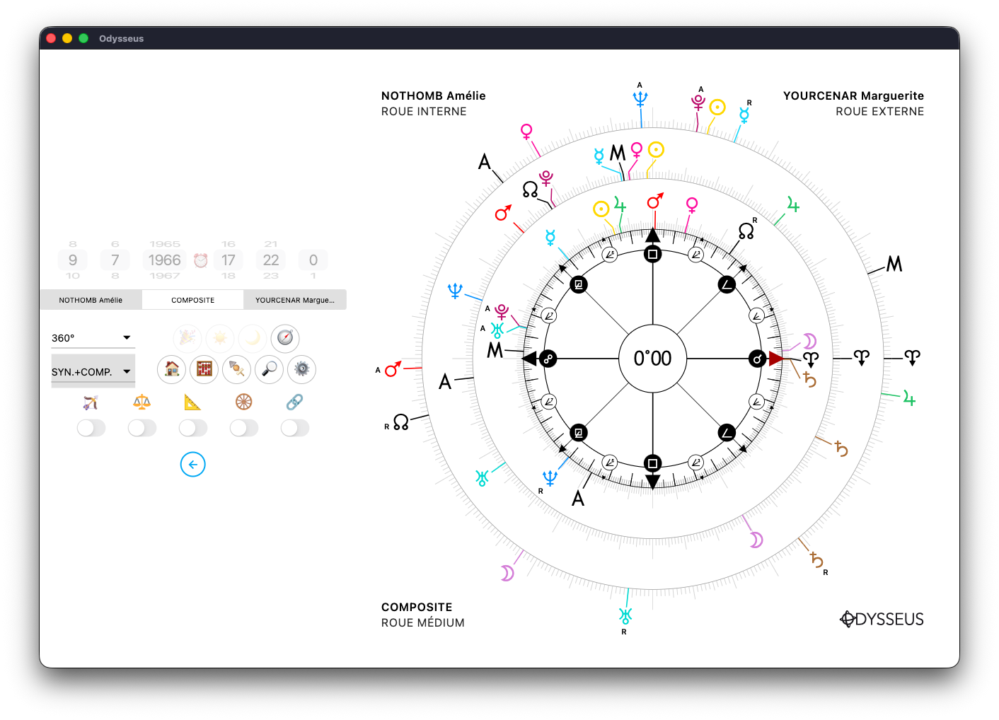 Une exception près : les fonctions de Révolution Solaire ☀️ et Révolution Lunaire 🌙 qui, ici, montent la révolution de l’astre en question par-dessus celui du Composite. Ainsi, vous pourrez regarder « l’anniversaire » ou le « mensiversaire » du thème de relation.