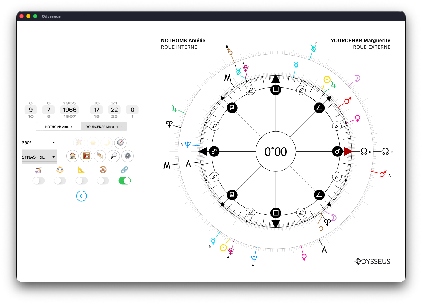 Alors la synastrie s’ouvre, présentant les deux thèmes l’un sur l’autre.