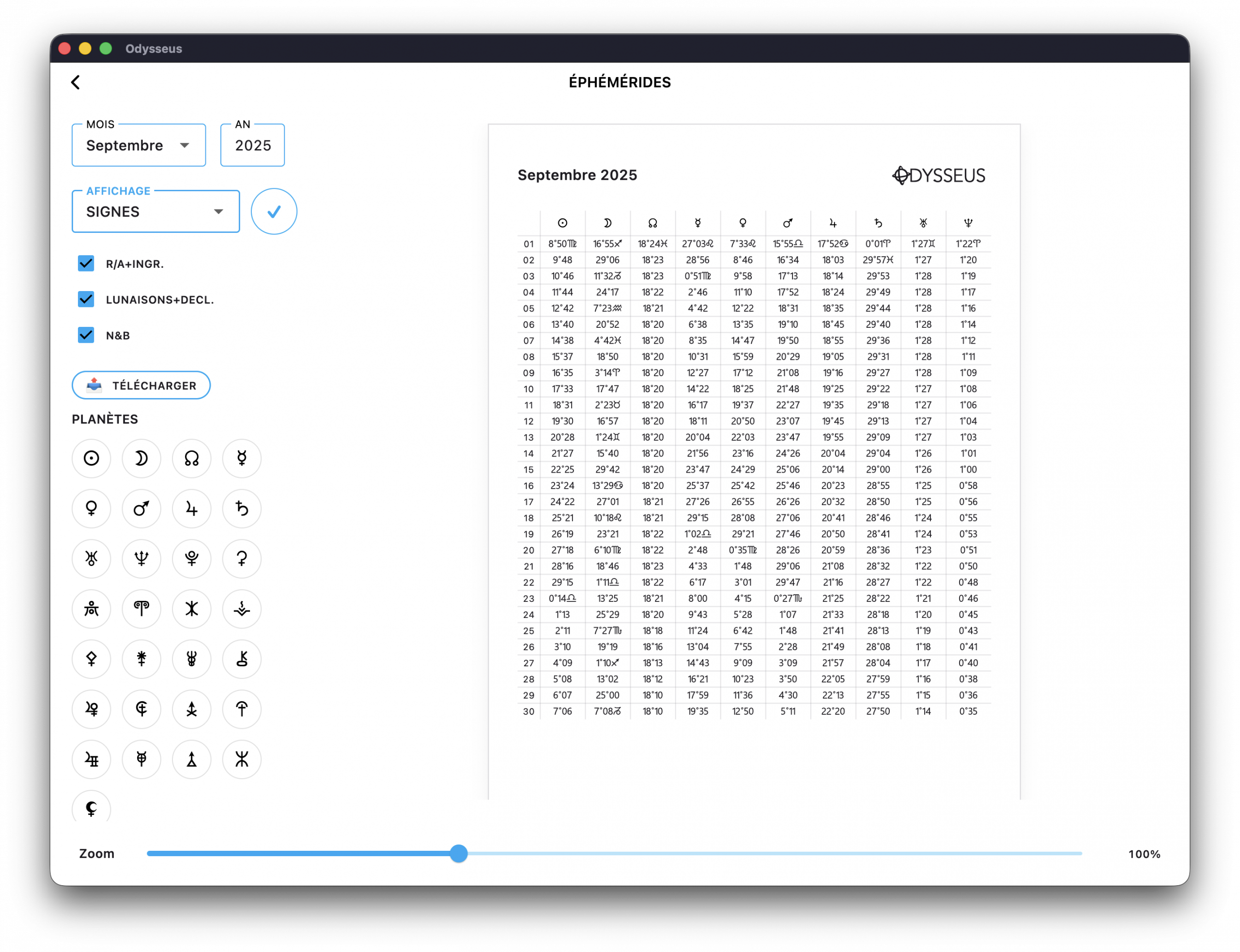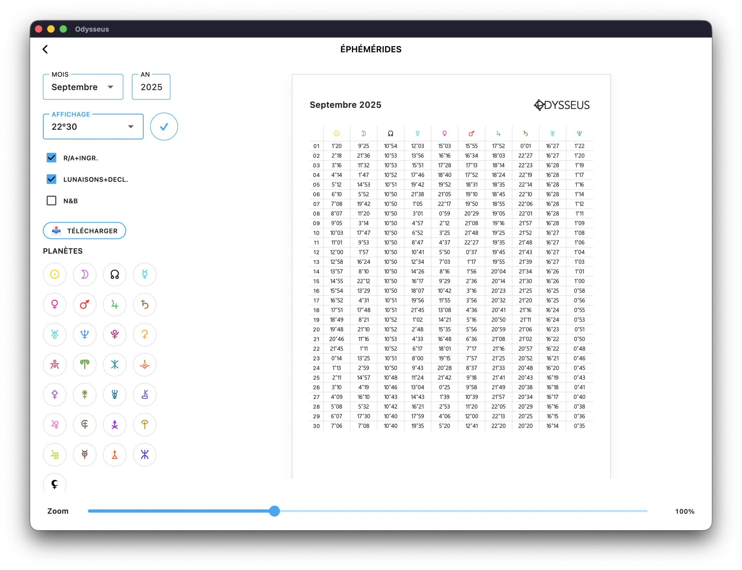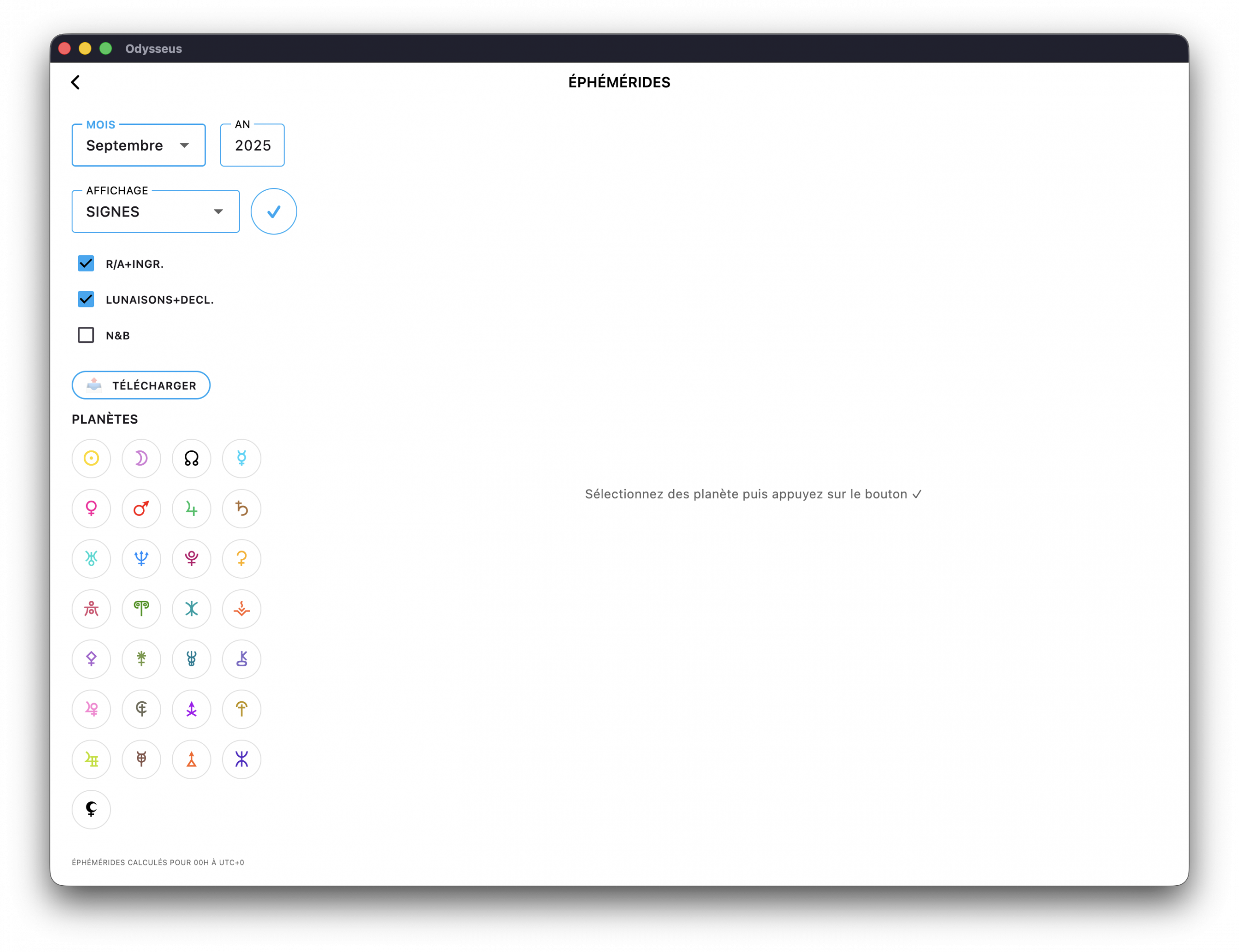 Ici, vous pouvez sélectionner les planète qui vous intéressent, le mois et l’année, puis cliquer sur le bouton bleu avec le ✓ pour générer l’éphéméride.