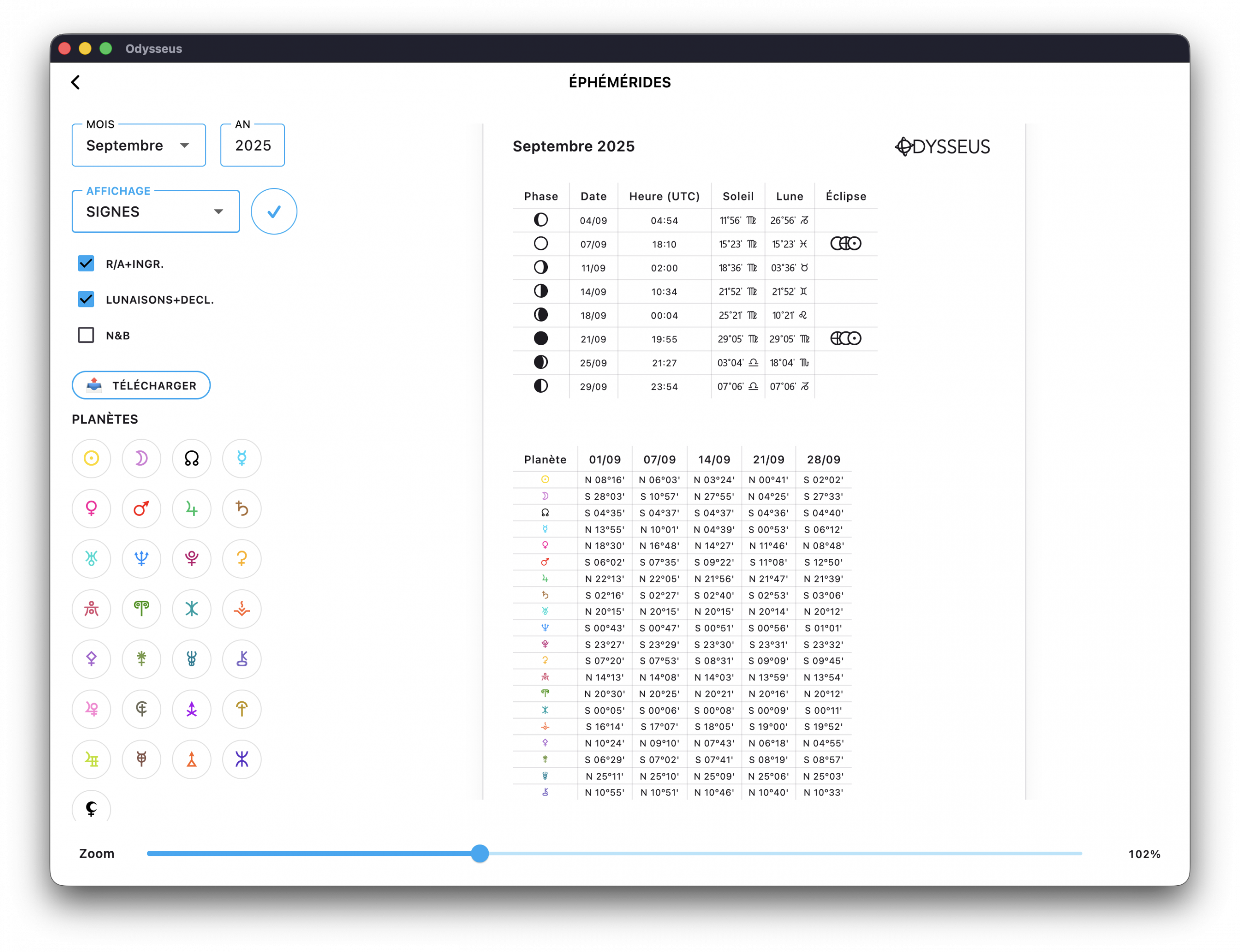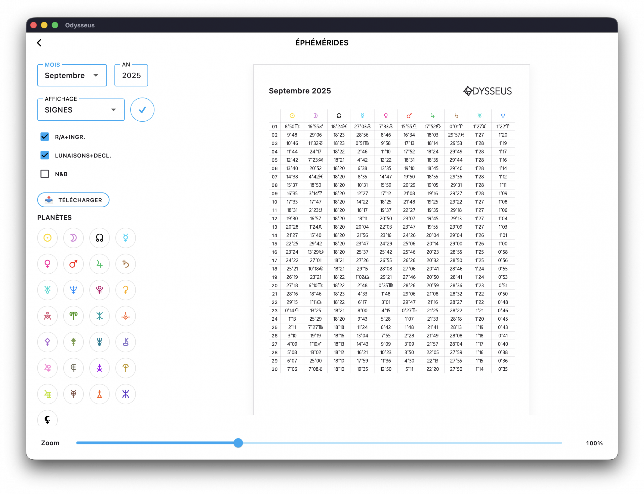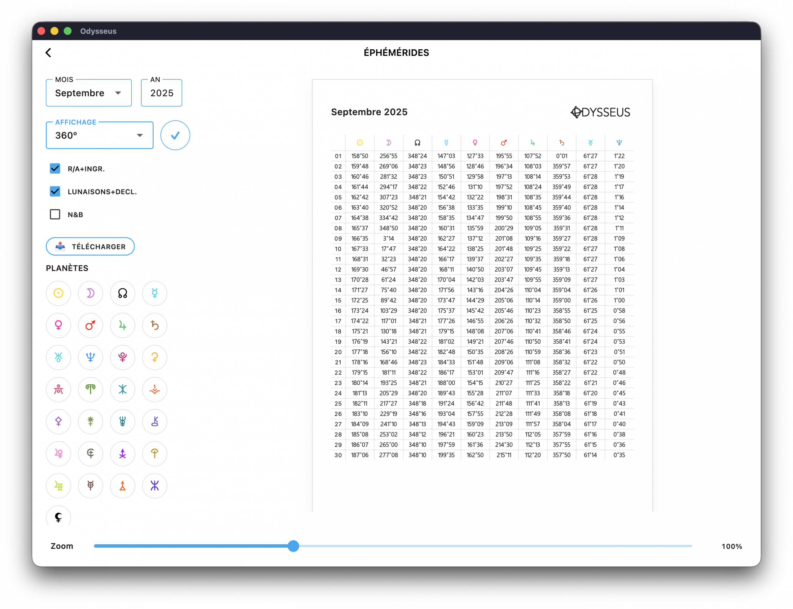 Vous avez également la possibilité de passer les symboles des planètes en noir avec le bouton N&B…