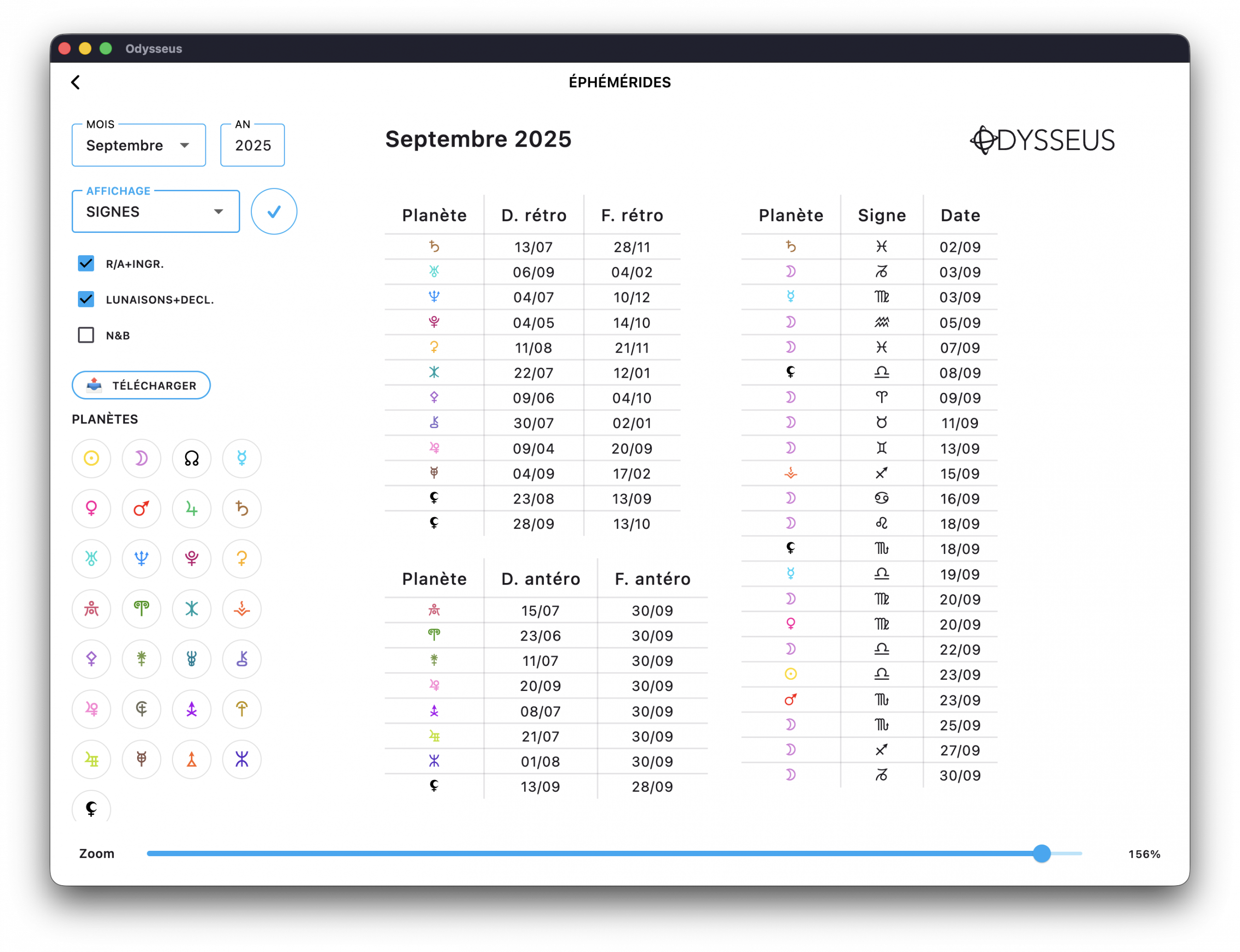 Deux pages supplémentaires sont ajoutées par défaut. La première informe des dates de rétrogradation et antérogradation (les dates peuvent dépasser le cadre du mois défini dans l’éphéméride afin de donner des plages de date exhaustives), et sur la droite, le tableau des ingrès planétaires (donc la date à laquelle une planète entre dans un signe).