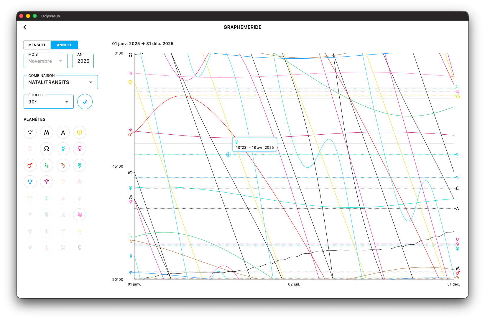 Dans l’exemple ci-dessus, on est sur un éphéméride graphique annuel de l’année 2025 croisant les lignes natales aux lignes de transit. On voit sur la droite les symboles des lignes/planètes du natal, et à gauche les symboles des lignes/planètes de transit.